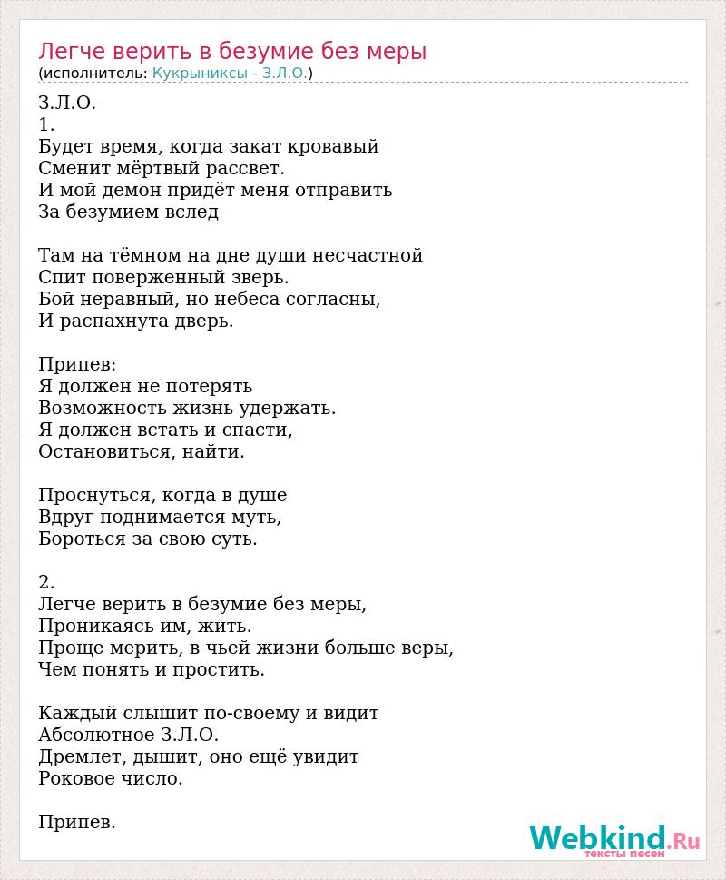З.Л.О. 1. Будет время, когда закат кровавый Сменит мёртвый рассвет. И мой демон придёт меня отправить За безумием вслед Там на тёмном на дне души несчастной Спит поверженный зверь. Бой неравный, но небеса согласны, И распахнута дверь. Припев: Я должен не потерять Возможность жизнь удержать. Я должен встать и спасти, Остановиться, найти. Проснуться, когда в душе Вдруг поднимается муть, Бороться за свою суть. 2. Легче верить в безумие без меры, Проникаясь им, жить. Проще мерить, в чьей жизни больше веры, Чем понять и простить. Каждый слышит по-своему и видит Абсолютное З.Л.О. Дремлет, дышит, оно ещё увидит Роковое число. Припев.