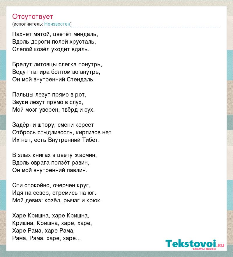 Пахнет мятой, цветёт миндаль, Вдоль дороги полей хрусталь, Слепой козёл уходит вдаль. Бредут литовцы слегка понутрь, Ведут тапира болтом во внутрь, Он мой внутренний Стендаль. Пальцы лезут прямо в рот, Звуки лезут прямо в слух, Мой мозг уверен, твёрд и сух. Задёрни штору, смени корсет Отбрось стыдливость, киргизов нет Их нет, есть Внутренний Тибет. В злых книгах в цвету жасмин, Вдоль оврага ползёт равин, Он мой внутренний павлин. Спи спокойно, очерчен круг, Идя на север, стремись на юг. Мой девиз: козёл, рычаг и крюк. Харе Кришна, харе Кришна, Кришна, Кришна, харе, харе, Харе Рама, харе Рама, Рама, Рама, харе, харе...