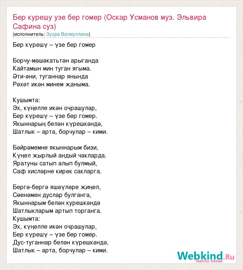 Бер күрешү – үзе бер гомер Борчу-мәшәкатьтән арыганда Кайтамын мин туган ягыма. Әти-әни, туганнар янында Рәхәт икән минем җаныма. Кушымта: Эх, күңелле икән очрашулар, Бер күрешү – үзе бер гомер. Якыннарың белән күрешкәндә, Шатлык – арта, борчулар – кими. Бәйрәмемне якыннарым бизи, Күңел җырлый андый чакларда. Яратуны сатып алып булмый, Саф хисләрне кирәк сакларга. Бергә-бергә яшәүләре җиңел, Сөенәмен дуслар булганга, Якыннарым белән курешкәндә Шатлыкларым артып торганга. Кушымта: Эх, күңелле икән очрашулар, Бер күрешү – үзе бер гомер. Дус-туганнар белән күрешкәндә, Шатлык – арта, борчулар – кими.