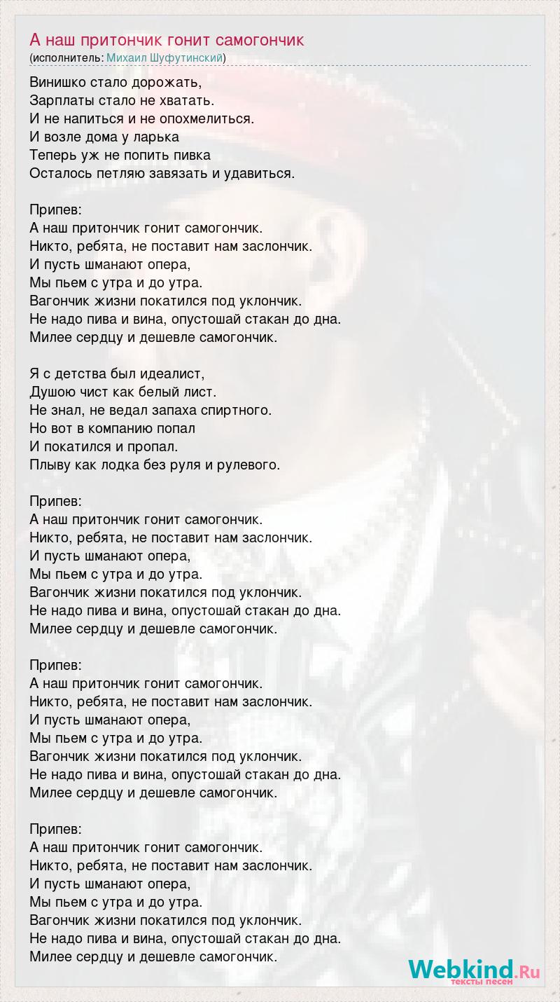 Винишко стало дорожать, Зарплаты стало не хватать. И не напиться и не опохмелиться. И возле дома у ларька Теперь уж не попить пивка Осталось петляю завязать и удавиться. Припев: А наш притончик гонит самогончик. Никто, ребята, не поставит нам заслончик. И пусть шманают опера, Мы пьем с утра и до утра. Вагончик жизни покатился под уклончик. Не надо пива и вина, опустошай стакан до дна. Милее сердцу и дешевле самогончик. Я с детства был идеалист, Душою чист как белый лист. Не знал, не ведал запаха спиртного. Но вот в компанию попал И покатился и пропал. Плыву как лодка без руля и рулевого. Припев: А наш притончик гонит самогончик. Никто, ребята, не поставит нам заслончик. И пусть шманают опера, Мы пьем с утра и до утра. Вагончик жизни покатился под уклончик. Не надо пива и вина, опустошай стакан до дна. Милее сердцу и дешевле самогончик. Припев: А наш притончик гонит самогончик. Никто, ребята, не поставит нам заслончик. И пусть шманают опера, Мы пьем с утра и до утра. Вагончик жизни покатился под уклончик. Не надо пива и вина, опустошай стакан до дна. Милее сердцу и дешевле самогончик. Припев: А наш притончик гонит самогончик. Никто, ребята, не поставит нам заслончик. И пусть шманают опера, Мы пьем с утра и до утра. Вагончик жизни покатился под уклончик. Не надо пива и вина, опустошай стакан до дна. Милее сердцу и дешевле самогончик.