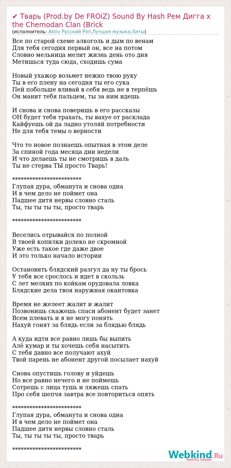 Все по старой схеме алкоголь и дым по венам Для тебя сегодня первый он, все на потом Словно мельница мелит жизнь день ото дня Метишься туда сюда, сходишь сума Новый ухажор возьмет нежно твою руку Ты в его плену на сегодня ты его сука Пей побольше вливай в себя ведь не в терпёшь Он манит тебя пальцем, ты за ним идешь И снова и снова поверишь в его рассказы ОН будет тебя трахать, ты вахуе от расклада Кайфуешь ой да ладно утоляй потребности Не для тебя темы о верности Что то новое познаешь опытная в этом деле За спиной года месяца дни недели И что делаешь ты не смотришь в даль Ты не стерва ТЫ просто Тварь! ************************ Глупая дура, обманута и снова одна И в чем дело не поймет она Падшее дитя нервы словно сталь Ты, ты ты ты ты, просто тварь ************************ Веселись отрывайся по полной В твоей копилки долеко не скромной Уже есть такое где даже двое И это только начало истории Остановить блядский разгул да ну ты брось У тебя все срослось и идет в скользь С лет мелких по койкам орудовала ловка Блядские дела твоя наружная окантовка Время не желеет жалит и жалит Позвонишь скажешь спаси абонент будет занет Всем плевать и я не могу понять Нахуй гонят за блядь если за блядью блядь А куда идти все равно лишь бы выпить Алё кумар и ты хочешь себя насытить С тебя давно все получают ахуй Твой парень не абонент другой посылает нахуй Снова опустишь голову и уйдешь Но все равно нечего и не поймешь Сотрешь с лица тушь и ляжешь спать Про себя шепчя завтра все повториться опять ************************ Глупая дура, обманута и снова одна И в чем дело не поймет она Падшее дитя нервы словно сталь Ты, ты ты ты ты, просто тварь ************************