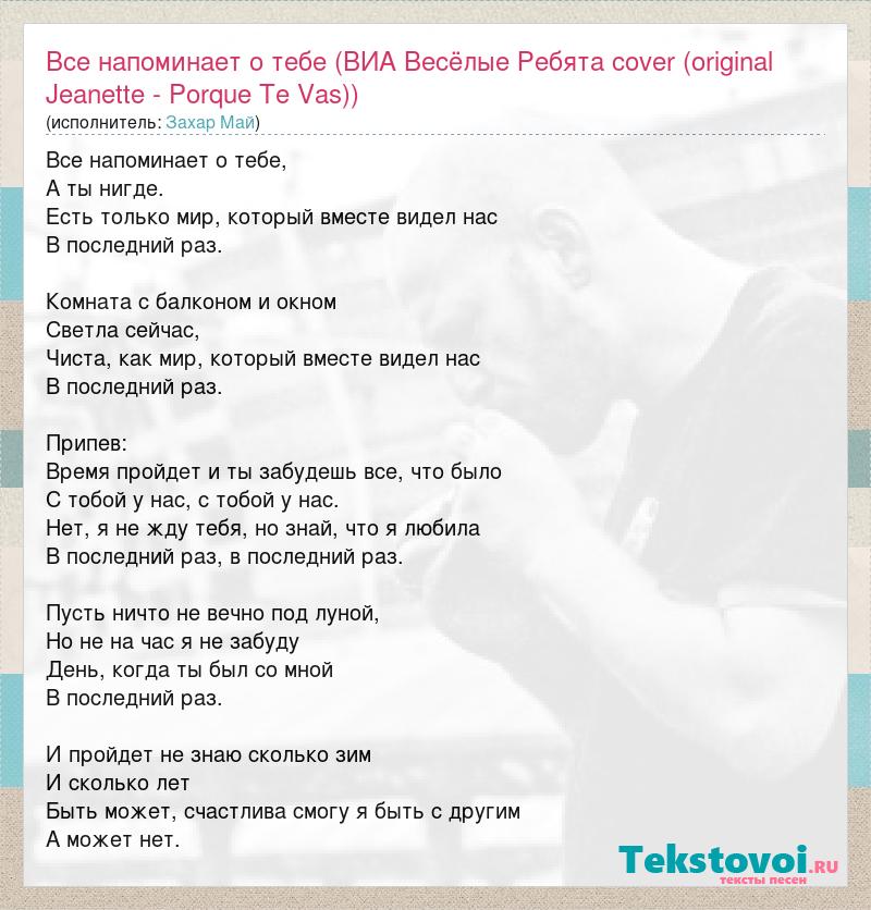 А как ты думаешь, о чем песня "Все напоминает о тебе (ВИА Весёлые Ребята cover (original Jeanette - Porque" ?