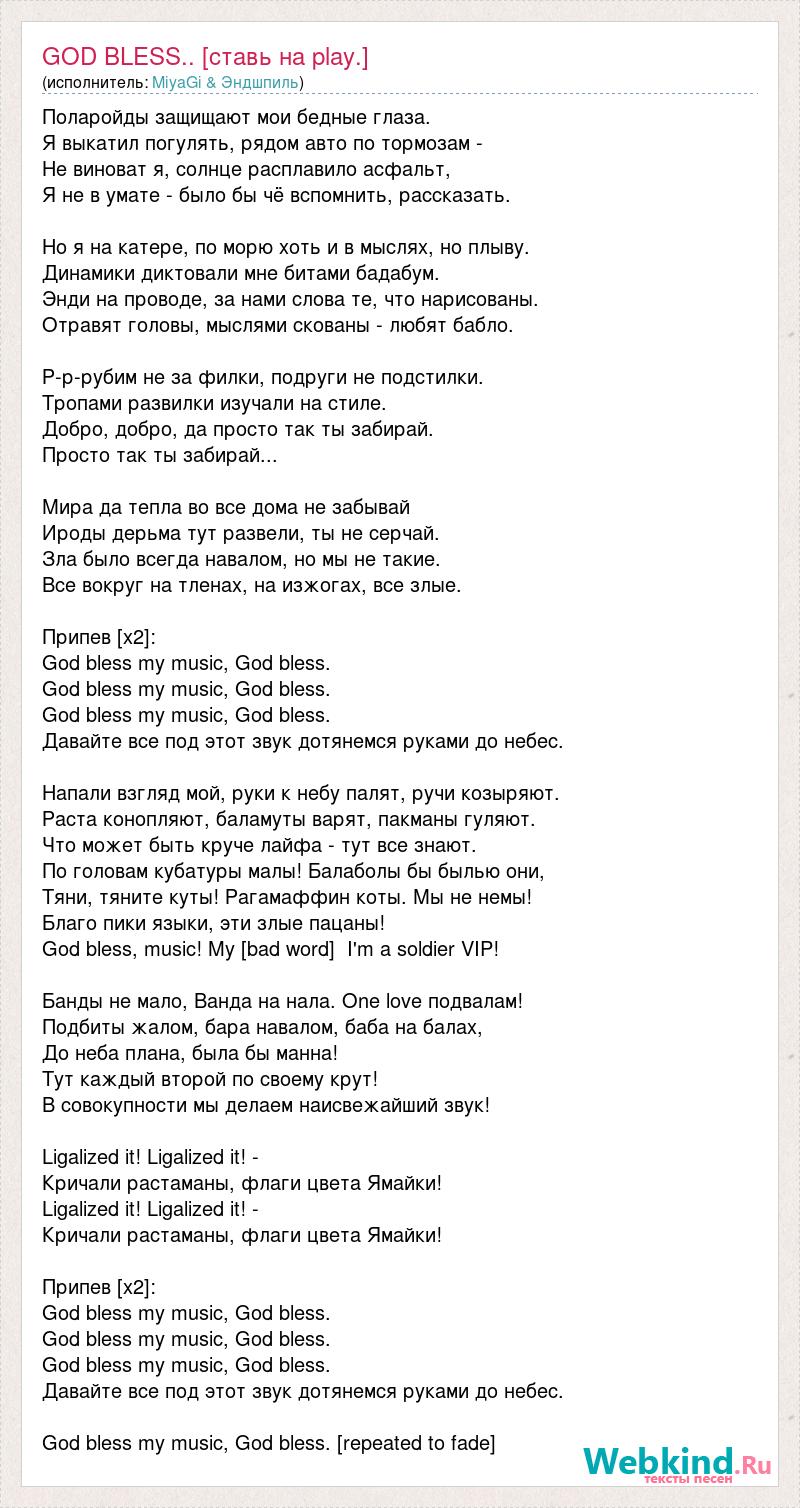 Поларойды защищают мои бедные глаза. Я выкатил погулять, рядом авто по тормозам - Не виноват я, солнце расплавило асфальт, Я не в умате - было бы чё вспомнить, рассказать. Но я на катере, по морю хоть и в мыслях, но плыву. Динамики диктовали мне битами бадабум. Энди на проводе, за нами слова те, что нарисованы. Отравят головы, мыслями скованы - любят бабло. Р-р-рубим не за филки, подруги не подстилки. Тропами развилки изучали на стиле. Добро, добро, да просто так ты забирай. Просто так ты забирай... Мира да тепла во все дома не забывай Ироды дерьма тут развели, ты не серчай. Зла было всегда навалом, но мы не такие. Все вокруг на тленах, на изжогах, все злые. Припев [х2]: God bless my music, God bless. God bless my music, God bless. God bless my music, God bless. Давайте все под этот звук дотянемся руками до небес. Напали взгляд мой, руки к небу палят, ручи козыряют. Раста конопляют, баламуты варят, пакманы гуляют. Что может быть круче лайфа - тут все знают. По головам кубатуры малы! Балаболы бы былью они, Тяни, тяните куты! Рагамаффин коты. Мы не немы! Благо пики языки, эти злые пацаны! God bless, music! My [bad word] I'm a soldier VIP! Банды не мало, Ванда на нала. One love подвалам! Подбиты жалом, бара навалом, баба на балах, До неба плана, была бы манна! Тут каждый второй по своему крут! В совокупности мы делаем наисвежайший звук! Ligalized it! Ligalized it! - Кричали растаманы, флаги цвета Ямайки! Ligalized it! Ligalized it! - Кричали растаманы, флаги цвета Ямайки! Припев [х2]: God bless my music, God bless. God bless my music, God bless. God bless my music, God bless. Давайте все под этот звук дотянемся руками до небес. God bless my music, God bless. [repeated to fade]