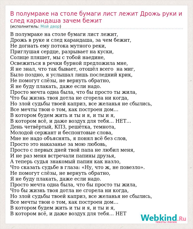 В полумраке на столе бумаги лист лежит, Дрожь в руке и след карандаша, за чем бежит, Не догнать ему потока мутного реки, Приглушая сердце, разрывает на куски, Солнце пляшет, мы с тобой наедине, Освежиться в речки бурной предложила мне, Я не знал, что так бывает, отошёл всего на миг, Было поздно, я услышал лишь последний крик, Не помогут слёзы, не вернуть обратно, Я не буду плакать, даже если надо. Просто мечта одна была, что бы просто ты жила, Что бы жизнь твоя дотла не сгорела ни когда, Но злой судьбы твоей каприз, все желанья не сбылись, Все мечты твои о том, как построен дом… В котором будем жить и ты и я, и ты и я, В котором всё, и даже воздух для тебя… НЕТ… День четвёртый, КПЗ, решётка, темнота, Молодой сержант и беспонтовые слова, Мне не надо объяснять, я понял всё без слов, Просто это наказанье за мою любовь, Просто с первых дней твой папа не любил меня, И не раз меня встречали папины друзья, А теперь судья знакомый папин как назло, Что сказать судьбе в глаза: «Ну, что ж, не повезло». Не помогут слёзы, не вернуть обратно, Я не буду плакать, даже если надо. Просто мечта одна была, что бы просто ты жила, Что бы жизнь твоя дотла не сгорела ни когда, Но злой судьбы твоей каприз, все желанья не сбылись, Все мечты твои о том, как построен дом… В котором будем жить и ты и я, и ты и я, В котором всё, и даже воздух для тебя… НЕТ