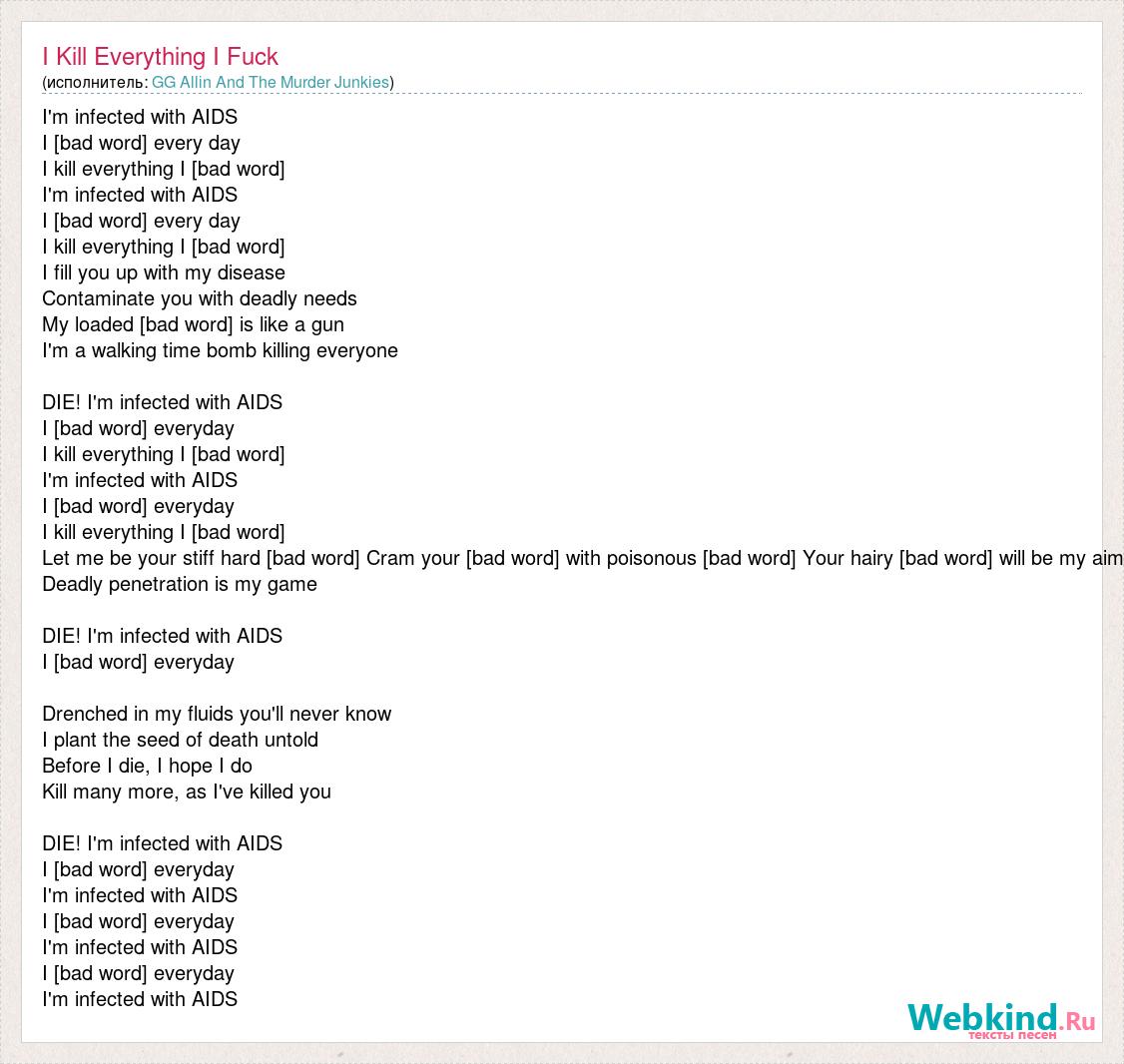 I'm infected with AIDS I [bad word] every day I kill everything I [bad word] I'm infected with AIDS I [bad word] every day I kill everything I [bad word] I fill you up with my disease Contaminate you with deadly needs My loaded [bad word] is like a gun I'm a walking time bomb killing everyone DIE! I'm infected with AIDS I [bad word] everyday I kill everything I [bad word] I'm infected with AIDS I [bad word] everyday I kill everything I [bad word] Let me be your stiff hard [bad word] Cram your [bad word] with poisonous [bad word] Your hairy [bad word] will be my aim Deadly penetration is my game DIE! I'm infected with AIDS I [bad word] everyday Drenched in my fluids you'll never know I plant the seed of death untold Before I die, I hope I do Kill many more, as I've killed you DIE! I'm infected with AIDS I [bad word] everyday I'm infected with AIDS I [bad word] everyday I'm infected with AIDS I [bad word] everyday I'm infected with AIDS
