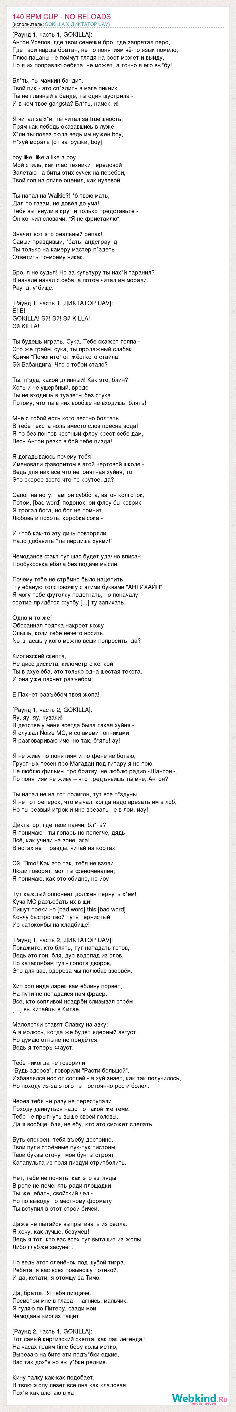 [Раунд 1, часть 1, GOKILLA]: Антон Усепов, где твои семечки бро, где запрятал перо, Где твои нарды братан, не по понятиям чё-то язык помело, Плюс пацаны не поймут глядя на рост может и выйду, Но я их поправлю ребята, не может, а точно я его вы*бу! Бл*ть, ты мамкин бандит, Твой пик - это сп*здить в маге пикник. Ты не главный в банде, ты один шустрила - И в чем твое gangsta? Бл*ть, намекни! Я читал за х*и, ты читал за true'шность, Прям как лебедь оказавшись в луже. Х*ли ты полез сюда ведь им нужен boy, Н*хуй мораль [от ватрушки, boy] boy like, like a like a boy Мой стиль, как mac техники передовой Залетаю на биты этих сучек на перебой, Твой гоп на стиле оценил, как нулевой! Ты напал на Walkie?! *б твою мать, Дал по газам, не довёл до ума! Тебя вытянули в круг и только представьте - Он кончил словами: "Я не фристайлю". Значит вот это реальный репак! Самый правдивый, *бать, андеграунд Ты только на камеру мастер п*здеть Ответить по-моему никак. Бро, я не судья! Но за культуру ты нах*й таранил? В начале начал с себя, а потом читал им морали. Раунд, у*бище. [Раунд 1, часть 1, ДИКТАТОР UAV]: Е! Е! GOKILLA! Эй! Эй! Эй KILLA! Эй KILLA! Ты будешь играть. Сука. Тебе скажет толпа - Это же грайм, сука, ты продажный слабак. Кричи "Помогите" от жёсткого стайла! Эй Бабандига! Что с тобой стало? Ты, п*зда, какой длинный! Как это, блин? Хоть и не ущербный, вроде Ты не входишь в туалеты без стука Потому, что ты в них вообще не входишь, блять! Мне с тобой есть кого лестно болтать. В тебе текста ноль вместо слов пресна вода! Я-то без понтов честный флоу крест себе дам, Весь Антон резко в бой тебе пизда! Я догадываюсь почему тебя Именовали фаворитом в этой чертовой школе - Ведь для них всё что непонятная хуйня, то Это скорее всего что-то крутое, да? Сапог на ногу, тампон суббота, вагон колготок, Потом, [bad word] подонок, эй флоу бы коврик Я трогал бога, но бог не помнит, Любовь и похоть, коробка сока - И чтоб как-то эту дичь повторяли, Надо добавить "ты пердишь хуями!" Чемоданов факт тут щас будет удачно вписан Пробуксовка ебала без подачи мысли. Почему тебе не стрёмно было нацепить "ту ебаную толстовочку с этими буквами "АНТИХАЙП" Я могу тебе футолку подогнать, но поначалу сортир придётся футбу [...] ту запихать. Одно и то же! Обосанная тряпка накроет кожу Слышь, коли тебе нечего носить, Nы знаешь у кого можно вещи попросить, да? Киргизский скепта, Не дисс дискета, километр с кепкой Ты в ахуе ёба, это только одна шестая текста, И она уже пахнёт разъёбом! Е Пахнет разъёбом твоя жопа! [Раунд 1, часть 2, GOKILLA]: Яу, яу, яу, чуваки! В детстве у меня всегда была такая хуйня - Я слушал Noize MC, и со вмеми гопниками Я разговариваю именно так, б*ять! ау! Я не живу по понятиям и по фене не ботаю, Грустных песен про Магадан под гитару я не пою. Не люблю фильмы про братву, не люблю радио «Шансон», По понятиям не живу – что предъявишь ты мне, Антон? Ты напал не на тот полигон, тут все п*здуны, Я не тот реперок, что мычал, когда надо врезать им в лоб, Но ты резвый игрок и мне врезать не в лом, йау! Диктатор, где твои панчи, бл*ть? Я понимаю - ты гопарь но полегче, дядь Всё, как учили на зоне, ага! В ногах нет правды, читай на кортах! Эй, Timo! Как это так, тебя не взяли... Люди говорят: мол ты феноменален; Я понимаю, как это обидно, но йоу - Тут каждый оппонент должен пёрнуть х*ем! Куча MC разъебать их в щи! Пишут треки но [bad word] this [bad word] Кончу быстро твой путь тернистый Из катокомбы на кладбище! [Раунд 1, часть 2, ДИКТАТОР UAV]: Покажите, кто 