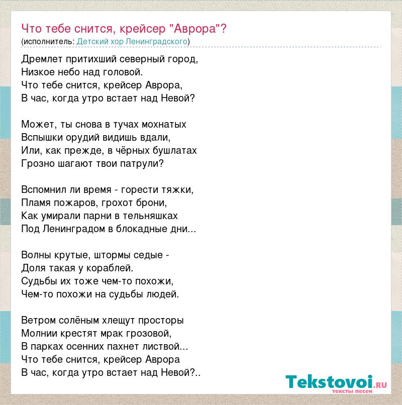 Дремлет притихший северный город, Низкое небо над головой. Что тебе снится, крейсер Аврора, В час, когда утро встает над Невой? Может, ты снова в тучах мохнатых Вспышки орудий видишь вдали, Или, как прежде, в чёрных бушлатах Грозно шагают твои патрули? Вспомнил ли время - горести тяжки, Пламя пожаров, грохот брони, Как умирали парни в тельняшках Под Ленинградом в блокадные дни... Волны крутые, штормы седые - Доля такая у кораблей. Судьбы их тоже чем-то похожи, Чем-то похожи на судьбы людей. Ветром солёным хлещут просторы Молнии крестят мрак грозовой, В парках осенних пахнет листвой... Что тебе снится, крейсер Аврора В час, когда утро встает над Невой?..