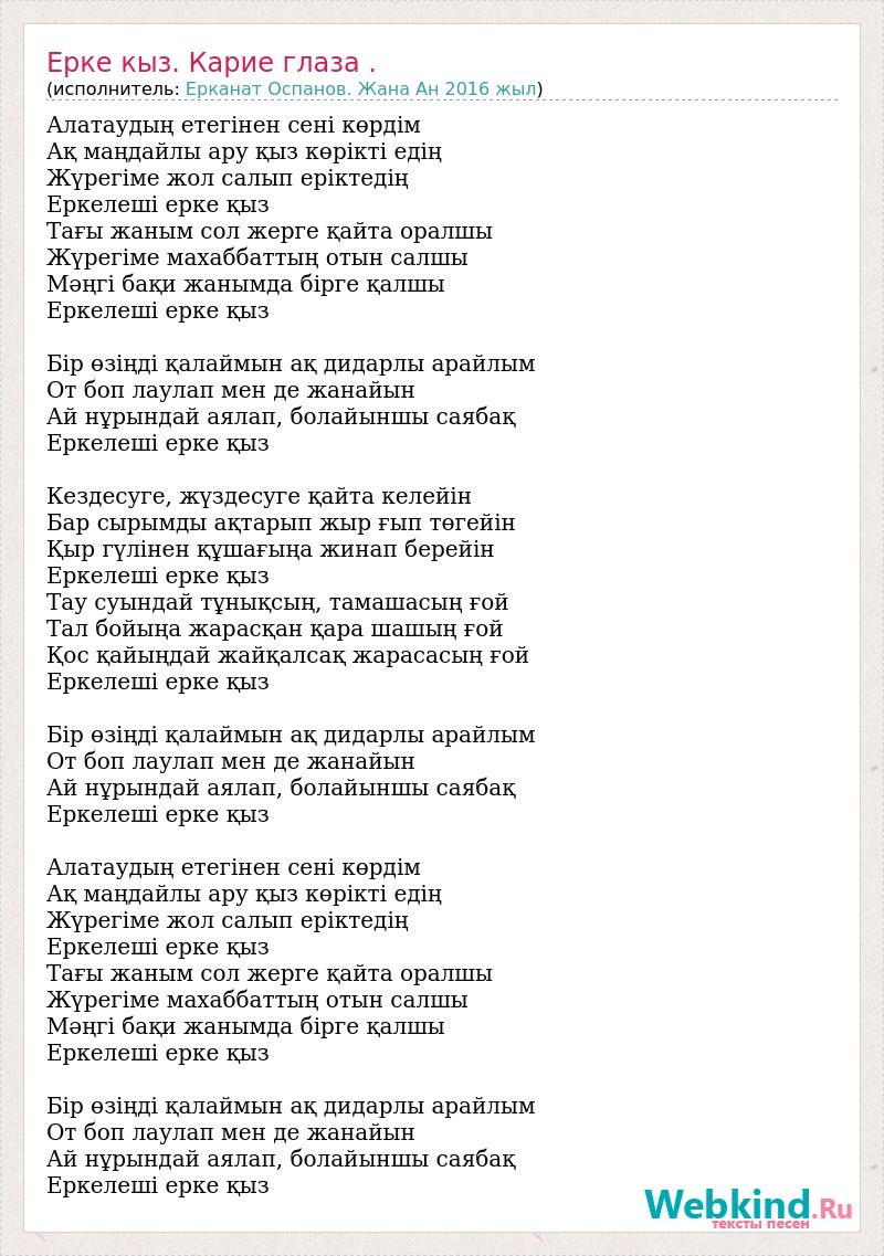 Алатаудың етегінен сені көрдім Ақ маңдайлы ару қыз көрікті едің Жүрегіме жол салып еріктедің Еркелеші ерке қыз Тағы жаным сол жерге қайта оралшы Жүрегіме махаббаттың отын салшы Мәңгі бақи жанымда бірге қалшы Еркелеші ерке қыз Бір өзіңді қалаймын ақ дидарлы арайлым От боп лаулап мен де жанайын Ай нұрындай аялап, болайыншы саябақ Еркелеші ерке қыз Кездесуге, жүздесуге қайта келейін Бар сырымды ақтарып жыр ғып төгейін Қыр гүлінен құшағыңа жинап берейін Еркелеші ерке қыз Тау суындай тұнықсың, тамашасың ғой Тал бойыңа жарасқан қара шашың ғой Қос қайыңдай жайқалсақ жарасасың ғой Еркелеші ерке қыз Бір өзіңді қалаймын ақ дидарлы арайлым От боп лаулап мен де жанайын Ай нұрындай аялап, болайыншы саябақ Еркелеші ерке қыз Алатаудың етегінен сені көрдім Ақ маңдайлы ару қыз көрікті едің Жүрегіме жол салып еріктедің Еркелеші ерке қыз Тағы жаным сол жерге қайта оралшы Жүрегіме махаббаттың отын салшы Мәңгі бақи жанымда бірге қалшы Еркелеші ерке қыз Бір өзіңді қалаймын ақ дидарлы арайлым От боп лаулап мен де жанайын Ай нұрындай аялап, болайыншы саябақ Еркелеші ерке қыз