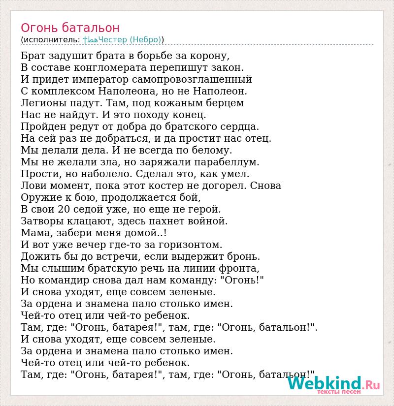 Брат задушит брата в борьбе за корону, В составе конгломерата перепишут закон. И придет император самопровозглашенный С комплексом Наполеона, но не Наполеон. Легионы падут. Там, под кожаным берцем Нас не найдут. И это походу конец. Пройден редут от добра до братского сердца. На сей раз не добраться, и да простит нас отец. Мы делали дела. И не всегда по белому. Мы не желали зла, но заряжали парабеллум. Прости, но наболело. Сделал это, как умел. Лови момент, пока этот костер не догорел. Снова Оружие к бою, продолжается бой, В свои 20 седой уже, но еще не герой. Затворы клацают, здесь пахнет войной. Мама, забери меня домой..! И вот уже вечер где-то за горизонтом. Дожить бы до встречи, если выдержит бронь. Мы слышим братскую речь на линии фронта, Но командир снова дал нам команду: "Огонь!" И снова уходят, еще совсем зеленые. За ордена и знамена пало столько имен. Чей-то отец или чей-то ребенок. Там, где: "Огонь, батарея!", там, где: "Огонь, батальон!". И снова уходят, еще совсем зеленые. За ордена и знамена пало столько имен. Чей-то отец или чей-то ребенок. Там, где: "Огонь, батарея!", там, где: "Огонь, батальон!".