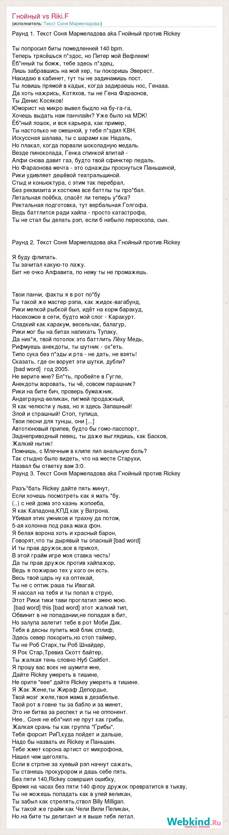 Раунд 1. Текст Соня Мармеладова aka Гнойный против Rickey Ты попросил биты помедленней 140 bpm. Теперь трясёшься п*здос, но Питер мой Вефлеем! Ёб*нный ты бомж, тебе здесь п*здец, Лишь забравшись на мой хер, ты покоришь Эверест. Накидаю в кабинет, тут ты не задинамишь пост. Ты ловишь прямой в кадык, когда задираешь ноc, Генааа. Да хоть нажрись, Котяхов, ты не Гена Фараонов, Ты Денис Косяков! Юморист на микро вывел быдло на бу-га-га, Хочешь выдать нам панчлайн? Уже было на MDK! Ёб*ный лошок, и вся карьера, как пример, Ты настолько не смешной, у тебя п*здил КВН. Искуссная шалава, ты с шарами как Надаль, Но плакал, когда порвали шоколадную медаль. Везде пиноколада, Генка спинкой впитай - Алфи снова давит газ, будто твой сфинктер педаль. Но Фараонова мечта - это однажды проснуться Паньшиной, Рики удивляет дешёвой театральщиной. Стыд и коньюктура, с этим так перебрал, Без реквизита и костюма все баттлы ты про*бал. Летальная поёбка, спасёт ли теперь у*бка? Ректальная подготовка, тут вербальная Голгофа. Ведь баттлится ради хайпа - просто катастрофа, Ты не стал бы делать рэп, если б небыло перескопа, сын. Раунд 2. Текст Соня Мармеладова aka Гнойный против Rickey Я буду флипать. Ты зачитал какую-то лажу. Бит не очко Алфавита, по нему ты не промажешь. Твои панчи, факты я в рот по*бу Ты такой же мастер рэпа, как жидок-вагабунд, Рики мелкой рыбкой был, идёт на корм баракуд, Насекомое в сети, будто мой слог - Каракурт. Сладкий как каракум, весельчак, балагур, Рики мог бы на битах напихать Тупаку, Да них*я, твой потолок это баттлить Лёху Медь, Рифмуешь анекдоты, ты шутник - ох*еть. Типо сука без п*зды и рта - не дать, не взять! Сказать, где он ворует эти шутки, дубли? [bad word] год 2005. Не верите мне? Бл*ть, пробейте в Гугле, Анекдоты воровать, ты чё, совсем парашник? Рики на бите бич, проверь бумажник. Андеграунд-великан, пигмей продажный, Я как челюсти у льва, но я здесь Запашный! Злой и страшный! Стоп, тупица, Твои песни для тунцы, они [...] Автотюновый припев, будто бы гомо-пасспорт, Заднеприводный певец, ты даже выглядишь, как Басков, Жалкий нытик! Помнишь, с Млечным в клипе лил анальную боль? Так стыдно было видеть, что на месте Старухи, Назвал бы ответку вам 3:0. Раунд 3. Текст Соня Мармеладова aka Гнойный против Rickey Разъ*бать Rickey дайте пять минут, Если хочешь посмотреть как я мать *бу. (..) с ней дома это казнь жопоеба, Я как Кападона,КПД как у Ватрона. Убивая этих умников и трахну да потом, 5-ая колонна под рака мака фон. Я белая ворона хоть и красный барон, Говорят,что ты дырявый ты опасный [bad word] И ты прав дружок,все в прикол, В этой грайм игре моя ставка честь! Да ты прав дружок против хайпажор, Ведь я пожираю тех у кого он есть. Весь твой царь ну ка оптекай, Ты не с оптик раша ты Ивагай. Я нассал на тебя и ты попал в струю, Этот Рики тики тави проглатил змею мою. [bad word] this [bad word] этот жалкий тип, Обвинит в не попадании,не попадая в бит, Но залупа залетит тебе в рот Моби Дик. Тебя в десны лупить мой блик сплиф, Здесь север покорить,но стоп таймер, Ты не Роб Старк,ты Роб Шнайдер, Я Рок Стар,Тревиз Скотт байтер, Ты жалкая тень словно Нуб Сайбот. Я прошу вас всех не шумите мне, Дайте Rickey умереть в тишине, Не орите "еее" дайте Rickey умереть в тишине. Я Жак Жене,ты Жираф Депордье, Твой мозг желе,твоя мама в дезабелье. Твой рот в говне ты за бабло и за минет, Это не битва за респект и ты не оппонент. Нее.. Соня не ебл*нил не прут как грибы, Жалкая срань ты 