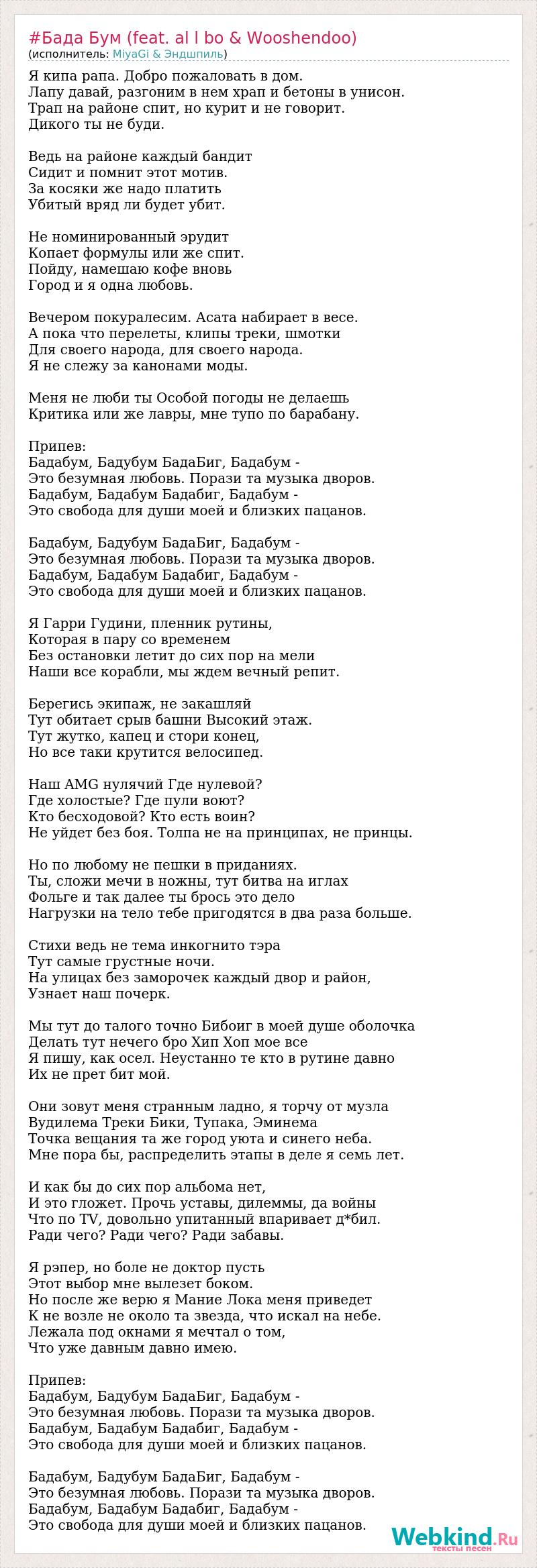 Я кипа рапа. Добро пожаловать в дом. Лапу давай, разгоним в нем храп и бетоны в унисон. Трап на районе спит, но курит и не говорит. Дикого ты не буди. Ведь на районе каждый бандит Сидит и помнит этот мотив. За косяки же надо платить Убитый вряд ли будет убит. Не номинированный эрудит Копает формулы или же спит. Пойду, намешаю кофе вновь Город и я одна любовь. Вечером покуралесим. Асата набирает в весе. А пока что перелеты, клипы треки, шмотки Для своего народа, для своего народа. Я не слежу за канонами моды. Меня не люби ты Особой погоды не делаешь Критика или же лавры, мне тупо по барабану. Припев: Бадабум, Бадубум БадаБиг, Бадабум - Это безумная любовь. Порази та музыка дворов. Бадабум, Бадабум Бадабиг, Бадабум - Это свобода для души моей и близких пацанов. Бадабум, Бадубум БадаБиг, Бадабум - Это безумная любовь. Порази та музыка дворов. Бадабум, Бадабум Бадабиг, Бадабум - Это свобода для души моей и близких пацанов. Я Гарри Гудини, пленник рутины, Которая в пару со временем Без остановки летит до сих пор на мели Наши все корабли, мы ждем вечный репит. Берегись экипаж, не закашляй Тут обитает срыв башни Высокий этаж. Тут жутко, капец и стори конец, Но все таки крутится велосипед. Наш AMG нулячий Где нулевой? Где холостые? Где пули воют? Кто бесходовой? Кто есть воин? Не уйдет без боя. Толпа не на принципах, не принцы. Но по любому не пешки в приданиях. Ты, сложи мечи в ножны, тут битва на иглах Фольге и так далее ты брось это дело Нагрузки на тело тебе пригодятся в два раза больше. Стихи ведь не тема инкогнито тэра Тут самые грустные ночи. На улицах без заморочек каждый двор и район, Узнает наш почерк. Мы тут до талого точно Бибоиг в моей душе оболочка Делать тут нечего бро Хип Хоп мое все Я пишу, как осел. Неустанно те кто в рутине давно Их не прет бит мой. Они зовут меня странным ладно, я торчу от музла Вудилема Треки Бики, Тупака, Эминема Точка вещания та же город уюта и синего неба. Мне пора бы, распределить этапы в деле я семь лет. И как бы до сих пор альбома нет, И это гложет. Прочь уставы, дилеммы, да войны Что по TV, довольно упитанный впаривает д*бил. Ради чего? Ради чего? Ради забавы. Я рэпер, но боле не доктор пусть Этот выбор мне вылезет боком. Но после же верю я Мание Лока меня приведет К не возле не около та звезда, что искал на небе. Лежала под окнами я мечтал о том, Что уже давным давно имею. Припев: Бадабум, Бадубум БадаБиг, Бадабум - Это безумная любовь. Порази та музыка дворов. Бадабум, Бадабум Бадабиг, Бадабум - Это свобода для души моей и близких пацанов. Бадабум, Бадубум БадаБиг, Бадабум - Это безумная любовь. Порази та музыка дворов. Бадабум, Бадабум Бадабиг, Бадабум - Это свобода для души моей и близких пацанов.