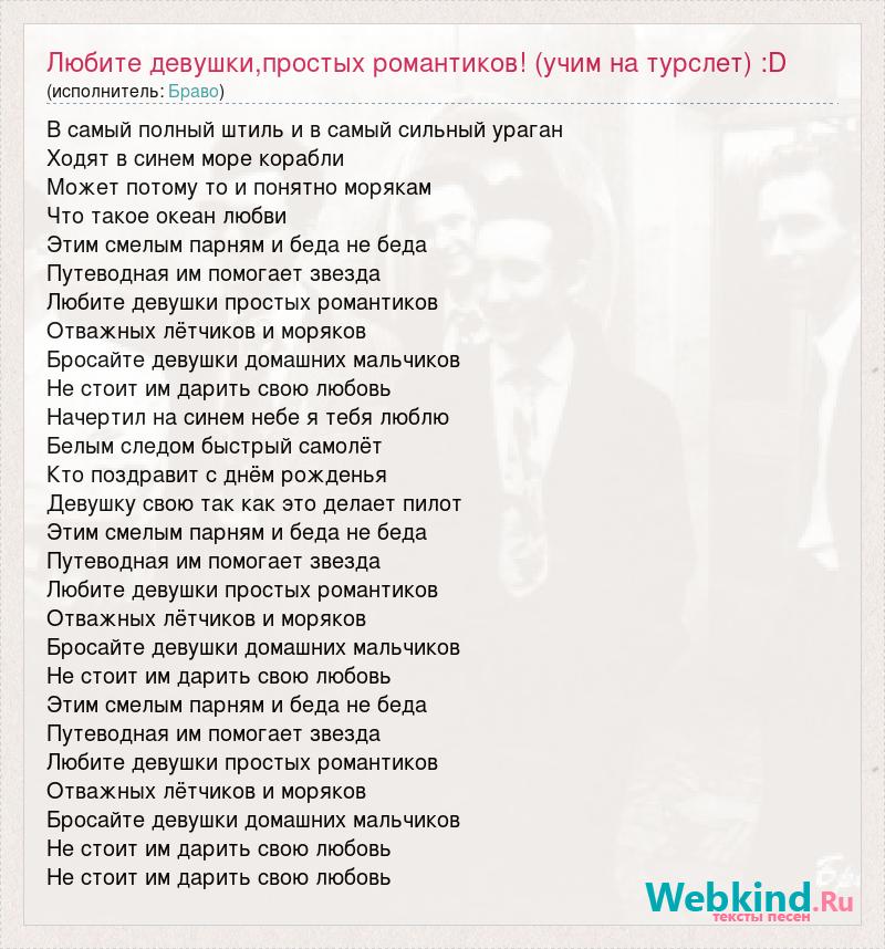 В самый полный штиль и в самый сильный ураган Ходят в синем море корабли Может потому то и понятно морякам Что такое океан любви Этим смелым парням и беда не беда Путеводная им помогает звезда Любите девушки простых романтиков Отважных лётчиков и моряков Бросайте девушки домашних мальчиков Не стоит им дарить свою любовь Начертил на синем небе я тебя люблю Белым следом быстрый самолёт Кто поздравит с днём рожденья Девушку свою так как это делает пилот Этим смелым парням и беда не беда Путеводная им помогает звезда Любите девушки простых романтиков Отважных лётчиков и моряков Бросайте девушки домашних мальчиков Не стоит им дарить свою любовь Этим смелым парням и беда не беда Путеводная им помогает звезда Любите девушки простых романтиков Отважных лётчиков и моряков Бросайте девушки домашних мальчиков Не стоит им дарить свою любовь Не стоит им дарить свою любовь