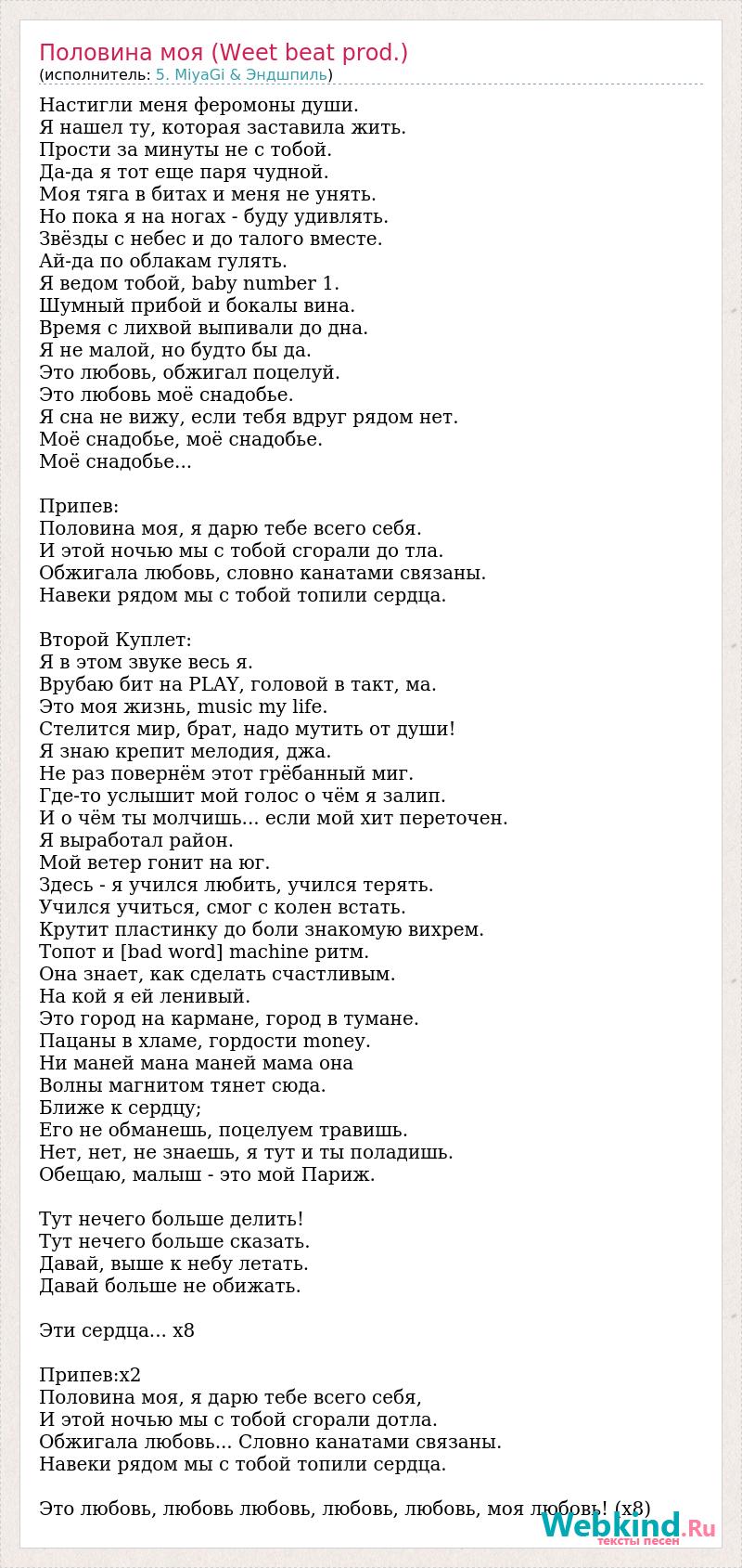 Настигли меня феромоны души. Я нашел ту, которая заставила жить. Прости за минуты не с тобой. Да-да я тот еще паря чудной. Моя тяга в битах и меня не унять. Но пока я на ногах - буду удивлять. Звёзды с небес и до талого вместе. Ай-да по облакам гулять. Я ведом тобой, baby number 1. Шумный прибой и бокалы вина. Время с лихвой выпивали до дна. Я не малой, но будто бы да. Это любовь, обжигал поцелуй. Это любовь моё снадобье. Я сна не вижу, если тебя вдруг рядом нет. Моё снадобье, моё снадобье. Моё снадобье... Припев: Половина моя, я дарю тебе всего себя. И этой ночью мы с тобой сгорали до тла. Обжигала любовь, словно канатами связаны. Навеки рядом мы с тобой топили сердца. Второй Куплет: Я в этом звуке весь я. Врубаю бит на PLAY, головой в такт, ма. Это моя жизнь, music my life. Стелится мир, брат, надо мутить от души! Я знаю крепит мелодия, джа. Не раз повернём этот грёбанный миг. Где-то услышит мой голос о чём я залип. И о чём ты молчишь... если мой хит переточен. Я выработал район. Мой ветер гонит на юг. Здесь - я учился любить, учился терять. Учился учиться, смог с колен встать. Крутит пластинку до боли знакомую вихрем. Топот и [bad word] machine ритм. Она знает, как сделать счастливым. На кой я ей ленивый. Это город на кармане, город в тумане. Пацаны в хламе, гордости money. Ни маней мана маней мама она Волны магнитом тянет сюда. Ближе к сердцу; Его не обманешь, поцелуем травишь. Нет, нет, не знаешь, я тут и ты поладишь. Обещаю, малыш - это мой Париж. Тут нечего больше делить! Тут нечего больше сказать. Давай, выше к небу летать. Давай больше не обижать. Эти сердца... x8 Припев:x2 Половина моя, я дарю тебе всего себя, И этой ночью мы с тобой сгорали дотла. Обжигала любовь... Словно канатами связаны. Навеки рядом мы с тобой топили сердца. Это любовь, любовь любовь, любовь, любовь, моя любовь! (х8)