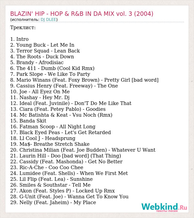 Треклист: 1. Intro 2. Young Buck - Let Me In 3. Terror Squad - Lean Back 4. The Roots - Duck Down 5. Brandy - Afrodisiac 6. The 411 - Dumb (Cool Kid Rmx) 7. Park Slope - We Like To Party 8. Mario Winans (Feat. Foxy Brown) - Pretty Girl [bad word] 9. Cassius Henry (Feat. Freeway) - The One 10. Joe - All Eyez On Me 11. Nashay - Hey Mr. Dj 12. Ideal (Feat. Juvinile) - Don'T Do Me Like That 13. Ciara (Feat. Petey Pablo) - Goodies 14. Mc Batishta & Keat - Vsu Noch (Rmx) 15. Banda Skit 16. Fatman Scoop - All Night Long 17. Black Eyed Peas - Let's Get Retarded 18. Ll Cool J - Headsprung 19. Ma$- Breathe Stretch Shake 20. Christina Milian (Feat. Joe Budden) - Whatever U Want 21. Laurin Hill - Doo [bad word] (That Thing) 22. Cassidy (Feat. Mashonda) - Get No Better 23. Ric-A-Che - Coo Coo Chee 24. Lumidee (Feat. Shells) - When We First Met 25. Lil Flip (Feat. Lea) - Sunshine 26. Smiles & Southstar - Tell Me 27. Akon (Feat. Styles P) - Locked Up Rmx 28. G-Unit (Feat. Joe) - Wanna Get To Know You 29. Nelly (Feat. Jaheim) - My Place