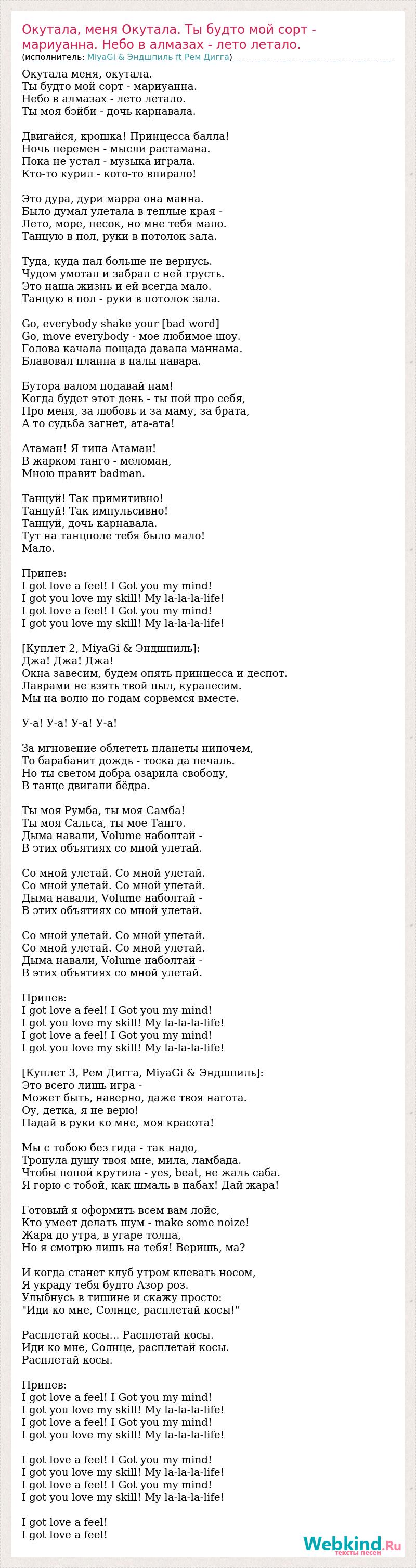 Окутала меня, окутала. Ты будто мой сорт - мариуанна. Небо в алмазах - лето летало. Ты моя бэйби - дочь карнавала. Двигайся, крошка! Принцесса балла! Ночь перемен - мысли растамана. Пока не устал - музыка играла. Кто-то курил - кого-то впирало! Это дура, дури марра она манна. Было думал улетала в теплые края - Лето, море, песок, но мне тебя мало. Танцую в пол, руки в потолок зала. Туда, куда пал больше не вернусь. Чудом умотал и забрал с ней грусть. Это наша жизнь и ей всегда мало. Танцую в пол - руки в потолок зала. Go, everybody shake your [bad word] Go, move everybody - мое любимое шоу. Голова качала пощада давала маннама. Блавовал планна в налы навара. Бутора валом подавай нам! Когда будет этот день - ты пой про себя, Про меня, за любовь и за маму, за брата, А то судьба загнет, ата-ата! Атаман! Я типа Атаман! В жарком танго - меломан, Мною правит badman. Танцуй! Так примитивно! Танцуй! Так импульсивно! Танцуй, дочь карнавала. Тут на танцполе тебя было мало! Мало. Припев: I got love a feel! I Got you my mind! I got you love my skill! My la-la-la-life! I got love a feel! I Got you my mind! I got you love my skill! My la-la-la-life! [Куплет 2, MiyaGi & Эндшпиль]: Джа! Джа! Джа! Окна завесим, будем опять принцесса и деспот. Лаврами не взять твой пыл, куралесим. Мы на волю по годам сорвемся вместе. У-а! У-а! У-а! У-а! За мгновение облететь планеты нипочем, То барабанит дождь - тоска да печаль. Но ты светом добра озарила свободу, В танце двигали бёдра. Ты моя Румба, ты моя Самба! Ты моя Сальса, ты мое Танго. Дыма навали, Volume наболтай - В этих объятиях со мной улетай. Со мной улетай. Со мной улетай. Со мной улетай. Со мной улетай. Дыма навали, Volume наболтай - В этих объятиях со мной улетай. Со мной улетай. Со мной улетай. Со мной улетай. Со мной улетай. Дыма навали, Volume наболтай - В этих объятиях со мной улетай. Припев: I got love a feel! I Got you my mind! I got you love my skill! My la-la-la-life! I got love a feel! I Got you my mind! I got you love my skill! My la-la-la-life! [Куплет 3, Рем Дигга, MiyaGi & Эндшпиль]: Это всего лишь игра - Может быть, наверно, даже твоя нагота. Оу, детка, я не верю! Падай в руки ко мне, моя красота! Мы с тобою без гида - так надо, Тронула душу твоя мне, мила, ламбада. Чтобы попой крутила - yes, beat, не жаль саба. Я горю с тобой, как шмаль в пабах! Дай жара! Готовый я оформить всем вам лойс, Кто умеет делать шум - make some noize! Жара до утра, в угаре толпа, Но я смотрю лишь на тебя! Веришь, ма? И когда станет клуб утром клевать носом, Я украду тебя будто Азор роз. Улыбнусь в тишине и скажу просто: "Иди ко мне, Солнце, расплетай косы!" Расплетай косы... Расплетай косы. Иди ко мне, Солнце, расплетай косы. Расплетай косы. Припев: I got love a feel! I Got you my mind! I got you love my skill! My la-la-la-life! I got love a feel! I Got you my mind! I got you love my skill! My la-la-la-life! I got love a feel! I Got you my mind! I got you love my skill! My la-la-la-life! I got love a feel! I Got you my mind! I got you love my skill! My la-la-la-life! I got love a feel! I got love a feel!