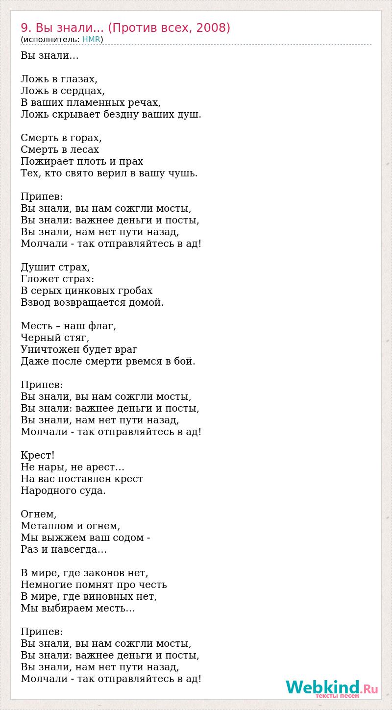 Вы знали… Ложь в глазах, Ложь в сердцах, В ваших пламенных речах, Ложь скрывает бездну ваших душ. Смерть в горах, Смерть в лесах Пожирает плоть и прах Тех, кто свято верил в вашу чушь. Припев: Вы знали, вы нам сожгли мосты, Вы знали: важнее деньги и посты, Вы знали, нам нет пути назад, Молчали - так отправляйтесь в ад! Душит страх, Гложет страх: В серых цинковых гробах Взвод возвращается домой. Месть – наш флаг, Черный стяг, Уничтожен будет враг Даже после смерти рвемся в бой. Припев: Вы знали, вы нам сожгли мосты, Вы знали: важнее деньги и посты, Вы знали, нам нет пути назад, Молчали - так отправляйтесь в ад! Крест! Не нары, не арест… На вас поставлен крест Народного суда. Огнем, Металлом и огнем, Мы выжжем ваш содом - Раз и навсегда… В мире, где законов нет, Немногие помнят про честь В мире, где виновных нет, Мы выбираем месть… Припев: Вы знали, вы нам сожгли мосты, Вы знали: важнее деньги и посты, Вы знали, нам нет пути назад, Молчали - так отправляйтесь в ад!