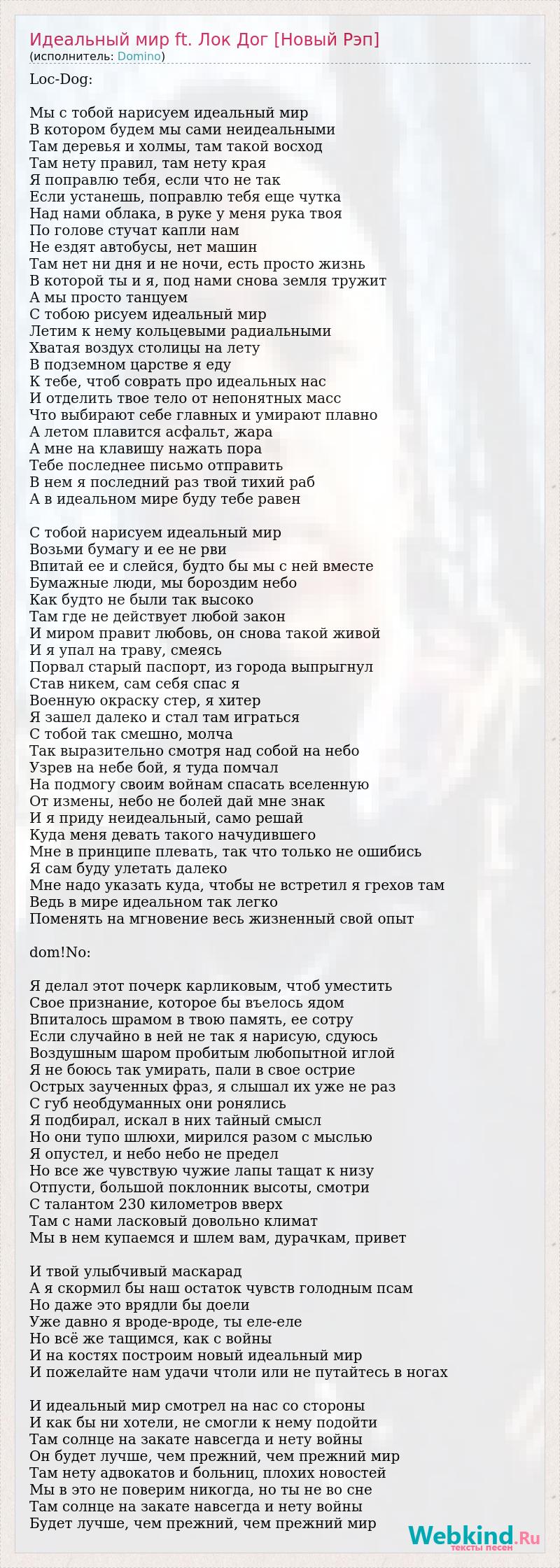 Loc-Dog: Мы с тобой нарисуем идеальный мир В котором будем мы сами неидеальными Там деревья и холмы, там такой восход Там нету правил, там нету края Я поправлю тебя, если что не так Если устанешь, поправлю тебя еще чутка Над нами облака, в руке у меня рука твоя По голове стучат капли нам Не ездят автобусы, нет машин Там нет ни дня и не ночи, есть просто жизнь В которой ты и я, под нами снова земля тружит А мы просто танцуем С тобою рисуем идеальный мир Летим к нему кольцевыми радиальными Хватая воздух столицы на лету В подземном царстве я еду К тебе, чтоб соврать про идеальных нас И отделить твое тело от непонятных масс Что выбирают себе главных и умирают плавно А летом плавится асфальт, жара А мне на клавишу нажать пора Тебе последнее письмо отправить В нем я последний раз твой тихий раб А в идеальном мире буду тебе равен С тобой нарисуем идеальный мир Возьми бумагу и ее не рви Впитай ее и слейся, будто бы мы с ней вместе Бумажные люди, мы бороздим небо Как будто не были так высоко Там где не действует любой закон И миром правит любовь, он снова такой живой И я упал на траву, смеясь Порвал старый паспорт, из города выпрыгнул Став никем, сам себя спас я Военную окраску стер, я хитер Я зашел далеко и стал там играться С тобой так смешно, молча Так выразительно смотря над собой на небо Узрев на небе бой, я туда помчал На подмогу своим войнам спасать вселенную От измены, небо не болей дай мне знак И я приду неидеальный, само решай Куда меня девать такого начудившего Мне в принципе плевать, так что только не ошибись Я сам буду улетать далеко Мне надо указать куда, чтобы не встретил я грехов там Ведь в мире идеальном так легко Поменять на мгновение весь жизненный свой опыт dom!No: Я делал этот почерк карликовым, чтоб уместить Свое признание, которое бы въелось ядом Впиталось шрамом в твою память, ее сотру Если случайно в ней не так я нарисую, сдуюсь Воздушным шаром пробитым любопытной иглой Я не боюсь так умирать, пали в свое острие Острых заученных фраз, я слышал их уже не раз С губ необдуманных они ронялись Я подбирал, искал в них тайный смысл Но они тупо шлюхи, мирился разом с мыслью Я опустел, и небо небо не предел Но все же чувствую чужие лапы тащат к низу Отпусти, большой поклонник высоты, смотри С талантом 230 километров вверх Там с нами ласковый довольно климат Мы в нем купаемся и шлем вам, дурачкам, привет И твой улыбчивый маскарад А я скормил бы наш остаток чувств голодным псам Но даже это врядли бы доели Уже давно я вроде-вроде, ты еле-еле Но всё же тащимся, как с войны И на костях построим новый идеальный мир И пожелайте нам удачи чтоли или не путайтесь в ногах И идеальный мир смотрел на нас со стороны И как бы ни хотели, не смогли к нему подойти Там солнце на закате навсегда и нету войны Он будет лучше, чем прежний, чем прежний мир Там нету адвокатов и больниц, плохих новостей Мы в это не поверим никогда, но ты не во сне Там солнце на закате навсегда и нету войны Будет лучше, чем прежний, чем прежний мир