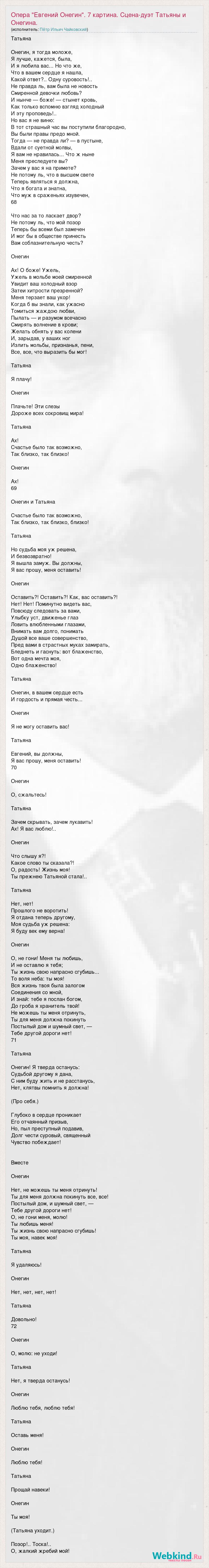Татьяна Онегин, я тогда моложе, Я лучше, кажется, была, И я любила вас... Но что же, Что в вашем сердце я нашла, Какой ответ?.. Одну суровость!.. Не правда ль, вам была не новость Смиренной девочки любовь? И нынче — боже! — стынет кровь, Как только вспомню взгляд холодный И эту проповедь!.. Но вас я не виню: В тот страшный час вы поступили благородно, Вы были правы предо мной. Тогда — не правда ли? — в пустыне, Вдали от суетной молвы, Я вам не нравилась... Что ж ныне Меня преследуете вы? Зачем у вас я на примете? Не потому ль, что в высшем свете Теперь являться я должна, Что я богата и знатна, Что муж в сраженьях изувечен, 68 Что нас за то ласкает двор? Не потому ль, что мой позор Теперь бы всеми был замечен И мог бы в обществе принесть Вам соблазнительную честь? Онегин Ах! О боже! Ужель, Ужель в мольбе моей смиренной Увидит ваш холодный взор Затеи хитрости презренной? Меня терзает ваш укор! Когда б вы знали, как ужасно Томиться жаждою любви, Пылать — и разумом всечасно Смирять волнение в крови; Желать обнять у вас колени И, зарыдав, у ваших ног Излить мольбы, признанья, пени, Все, все, что выразить бы мог! Татьяна Я плачу! Онегин Плачьте! Эти слезы Дороже всех сокровищ мира! Татьяна Ах! Счастье было так возможно, Так близко, так близко! Онегин Ах! 69 Онегин и Татьяна Счастье было так возможно, Так близко, так близко, близко! Татьяна Но судьба моя уж решена, И безвозвратно! Я вышла замуж. Вы должны, Я вас прошу, меня оставить! Онегин Оставить?! Оставить?! Как, вас оставить?! Нет! Нет! Поминутно видеть вас, Повсюду следовать за вами, Улыбку уст, движенье глаз Ловить влюбленными глазами, Внимать вам долго, понимать Душой все ваше совершенство, Пред вами в страстных муках замирать, Бледнеть и гаснуть: вот блаженство, Вот одна мечта моя, Одно блаженство! Татьяна Онегин, в вашем сердце есть И гордость и прямая честь... Онегин Я не могу оставить вас! Татьяна Евгений, вы должны, Я вас прошу, меня оставить! 70 Онегин О, сжальтесь! Татьяна Зачем скрывать, зачем лукавить! Ах! Я вас люблю!.. Онегин Что слышу я?! Какое слово ты сказала?! О, радость! Жизнь моя! Ты прежнею Татьяной стала!.. Татьяна Нет, нет! Прошлого не воротить! Я отдана теперь другому, Моя судьба уж решена: Я буду век ему верна! Онегин О, не гони! Меня ты любишь, И не оставлю я тебя; Ты жизнь свою напрасно сгубишь... То воля неба: ты моя! Вся жизнь твоя была залогом Соединения со мной, И знай: тебе я послан богом, До гроба я хранитель твой! Не можешь ты меня отринуть, Ты для меня должна покинуть Постылый дом и шумный свет, — Тебе другой дороги нет! 71 Татьяна Онегин! Я тверда останусь: Судьбой другому я дана, С ним буду жить и не расстанусь, Нет, клятвы помнить я должна! (Про себя.) Глубоко в сердце проникает Его отчаянный призыв, Но, пыл преступный подавив, Долг чести суровый, священный Чувство побеждает! Вместе Онегин Нет, не можешь ты меня отринуть! Ты для меня должна покинуть все, все! Постылый дом, и шумный свет, — Тебе другой дороги нет! О, не гони меня, молю! Ты любишь меня! Ты жизнь свою напрасно сгубишь! Ты моя, навек моя! Татьяна Я удаляюсь! Онегин Нет, нет, нет, нет! Татьяна Довольно! 72 Онегин О, молю: не уходи! Татьяна Нет, я тверда останусь! Онегин Люблю тебя, люблю тебя! Татьяна Оставь меня! Онегин Люблю тебя! Татьяна Прощай навеки! Онегин Ты моя! (Татьяна уходит.) Позор!.. Тоска!.. О, жалкий жребий мой!