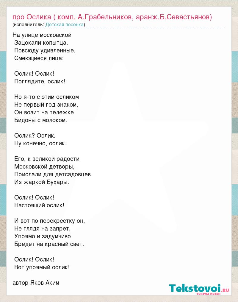 На улице московской Зацокали копытца. Повсюду удивленные, Смеющиеся лица: Ослик! Ослик! Поглядите, ослик! Но я-то с этим осликом Не первый год знаком, Он возит на тележке Бидоны с молоком. Ослик? Ослик. Ну конечно, ослик. Его, к великой радости Московской детворы, Прислали для детсадовцев Из жаркой Бухары. Ослик! Ослик! Настоящий ослик! И вот по перекрестку он, Не глядя на запрет, Упрямо и задумчиво Бредет на красный свет. Ослик! Ослик! Вот упрямый ослик! автор Яков Аким