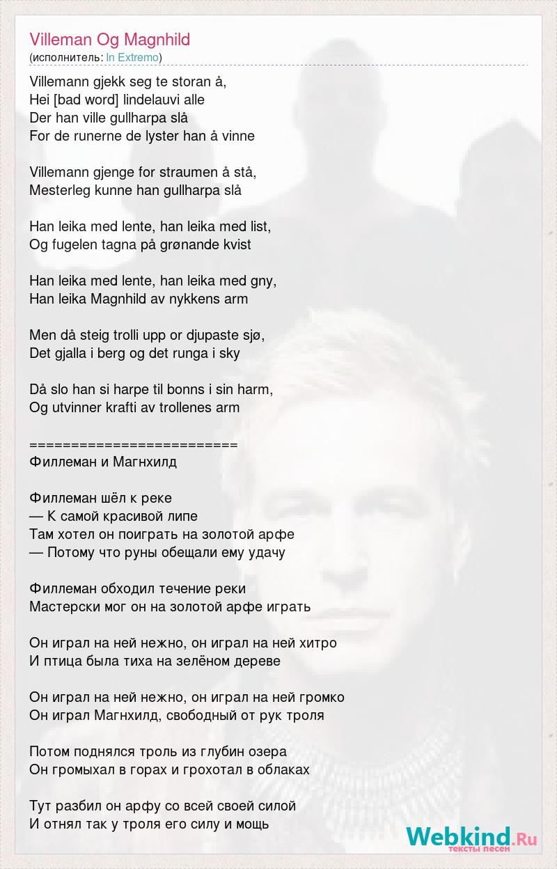Villemann gjekk seg te storan å, Hei [bad word] lindelauvi alle Der han ville gullharpa slå For de runerne de lyster han å vinne Villemann gjenge for straumen å stå, Mesterleg kunne han gullharpa slå Han leika med lente, han leika med list, Og fugelen tagna på grønande kvist Han leika med lente, han leika med gny, Han leika Magnhild av nykkens arm Men då steig trolli upp or djupaste sjø, Det gjalla i berg og det runga i sky Då slo han si harpe til bonns i sin harm, Og utvinner krafti av trollenes arm ========================= Филлеман и Магнхилд Филлеман шёл к реке — К самой красивой липе Там хотел он поиграть на золотой арфе — Потому что руны обещали ему удачу Филлеман обходил течение реки Мастерски мог он на золотой арфе играть Он играл на ней нежно, он играл на ней хитро И птица была тиха на зелёном дереве Он играл на ней нежно, он играл на ней громко Он играл Магнхилд, свободный от рук троля Потом поднялся троль из глубин озера Он громыхал в горах и грохотал в облаках Тут разбил он арфу со всей своей силой И отнял так у троля его силу и мощь