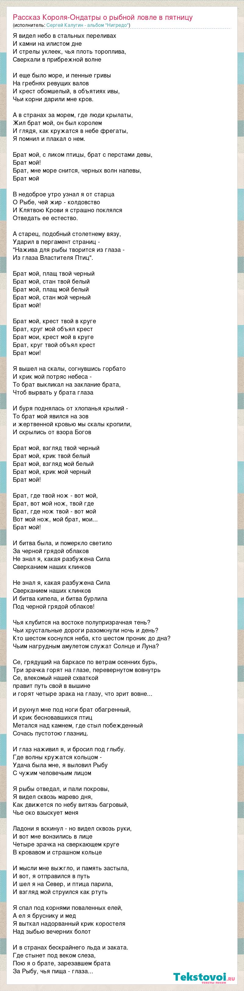 Главная→Исполнители→Сергей Калугин - альбом "Нигредо"→Рассказ Короля-Ондатры о рыбной ловле в пятницу