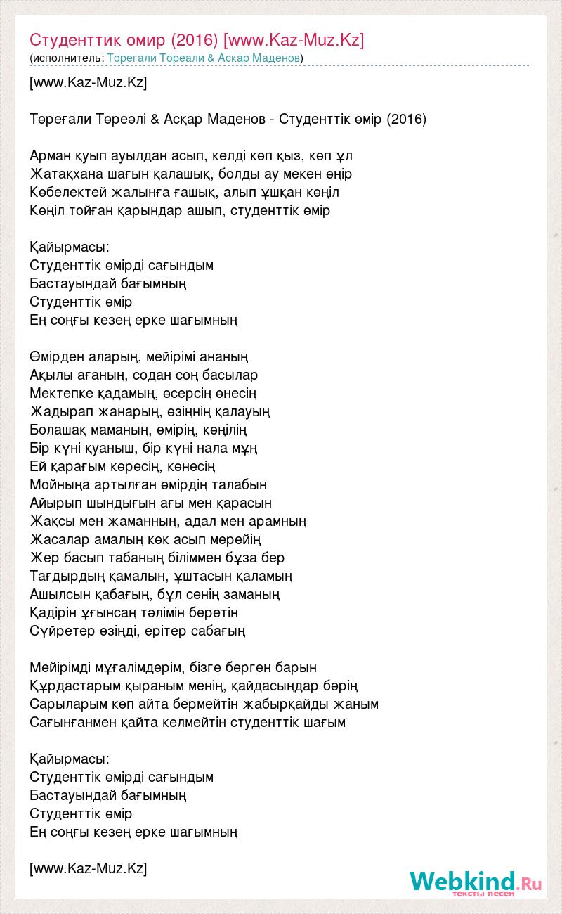 [www.Kaz-Muz.Kz] Төреғали Төреәлі & Асқар Маденов - Студенттік өмір (2016) Арман қуып ауылдан асып, келді көп қыз, көп ұл Жатақхана шағын қалашық, болды ау мекен өңір Көбелектей жалынға ғашық, алып ұшқан көңіл Көңіл тойған қарындар ашып, студенттік өмір Қайырмасы: Студенттік өмірді сағындым Бастауындай бағымның Студенттік өмір Ең соңғы кезең ерке шағымның Өмірден аларың, мейірімі ананың Ақылы ағаның, содан соң басылар Мектепке қадамың, өсерсің өнесің Жадырап жанарың, өзіңнің қалауың Болашақ маманың, өмірің, көңілің Бір күні қуаныш, бір күні нала мұң Ей қарағым көресің, көнесің Мойныңа артылған өмірдің талабын Айырып шындығын ағы мен қарасын Жақсы мен жаманның, адал мен арамның Жасалар амалың көк асып мерейің Жер басып табаның біліммен бұза бер Тағдырдың қамалын, ұштасын қаламың Ашылсын қабағың, бұл сенің заманың Қадірін ұғынсаң тәлімін беретін Сүйретер өзіңді, ерітер сабағың Мейірімді мұғалімдерім, бізге берген барын Құрдастарым қыраным менің, қайдасыңдар бәрің Сарыларым көп айта бермейтін жабырқайды жаным Сағынғанмен қайта келмейтін студенттік шағым Қайырмасы: Студенттік өмірді сағындым Бастауындай бағымның Студенттік өмір Ең соңғы кезең ерке шағымның [www.Kaz-Muz.Kz]