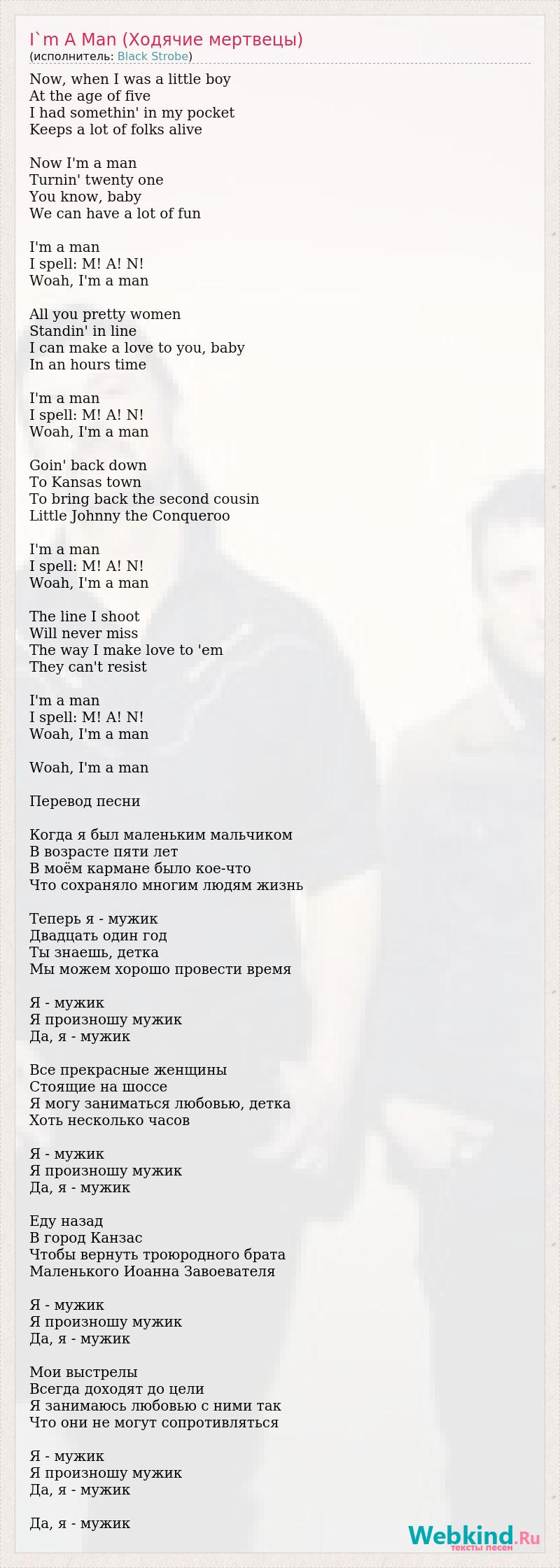 Now, when I was a little boy At the age of five I had somethin' in my pocket Keeps a lot of folks alive Now I'm a man Turnin' twenty one You know, baby We can have a lot of fun I'm a man I spell: M! A! N! Woah, I'm a man All you pretty women Standin' in line I can make a love to you, baby In an hours time I'm a man I spell: M! A! N! Woah, I'm a man Goin' back down To Kansas town To bring back the second cousin Little Johnny the Conqueroo I'm a man I spell: M! A! N! Woah, I'm a man The line I shoot Will never miss The way I make love to 'em They can't resist I'm a man I spell: M! A! N! Woah, I'm a man Woah, I'm a man Перевод песни Когда я был маленьким мальчиком В возрасте пяти лет В моём кармане было кое-что Что сохраняло многим людям жизнь Теперь я - мужик Двадцать один год Ты знаешь, детка Мы можем хорошо провести время Я - мужик Я произношу мужик Да, я - мужик Все прекрасные женщины Стоящие на шоссе Я могу заниматься любовью, детка Хоть несколько часов Я - мужик Я произношу мужик Да, я - мужик Еду назад В город Канзас Чтобы вернуть троюродного брата Маленького Иоанна Завоевателя Я - мужик Я произношу мужик Да, я - мужик Мои выстрелы Всегда доходят до цели Я занимаюсь любовью с ними так Что они не могут сопротивляться Я - мужик Я произношу мужик Да, я - мужик Да, я - мужик