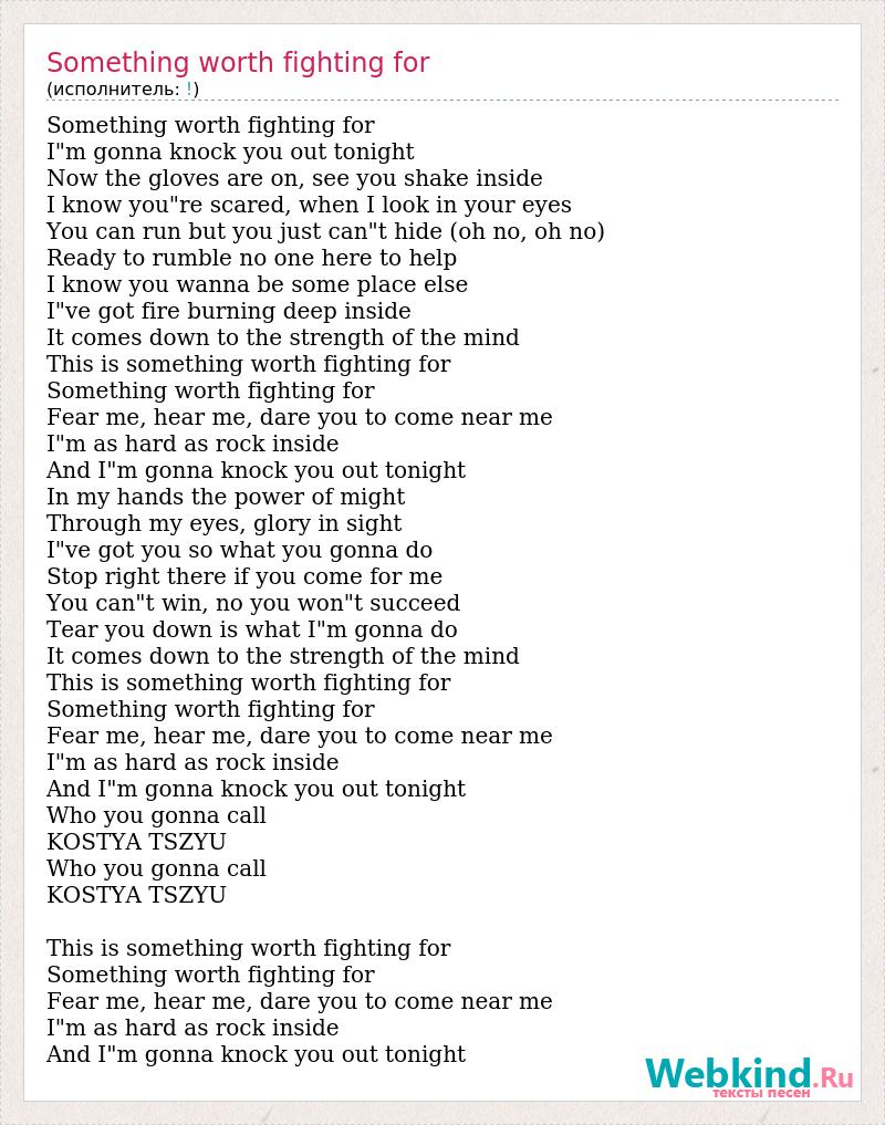 Something worth fighting for I"m gonna knock you out tonight Now the gloves are on, see you shake inside I know you"re scared, when I look in your eyes You can run but you just can"t hide (oh no, oh no) Ready to rumble no one here to help I know you wanna be some place else I"ve got fire burning deep inside It comes down to the strength of the mind This is something worth fighting for Something worth fighting for Fear me, hear me, dare you to come near me I"m as hard as rock inside And I"m gonna knock you out tonight In my hands the power of might Through my eyes, glory in sight I"ve got you so what you gonna do Stop right there if you come for me You can"t win, no you won"t succeed Tear you down is what I"m gonna do It comes down to the strength of the mind This is something worth fighting for Something worth fighting for Fear me, hear me, dare you to come near me I"m as hard as rock inside And I"m gonna knock you out tonight Who you gonna call KOSTYA TSZYU Who you gonna call KOSTYA TSZYU This is something worth fighting for Something worth fighting for Fear me, hear me, dare you to come near me I"m as hard as rock inside And I"m gonna knock you out tonight
