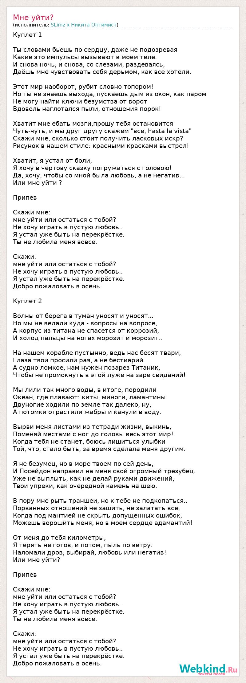 Куплет 1 Ты словами бьешь по сердцу, даже не подозревая Какие это импульсы вызывают в моем теле. И снова ночь, и снова, со слезами, раздеваясь, Даёшь мне чувствовать себя дерьмом, как все хотели. Этот мир наоборот, рубит словно топором! Но ты не знаешь выхода, пускаешь дым из окон, как паром Не могу найти ключи безумства от ворот Вдоволь наглотался пыли, отношения порок! Хватит мне ебать мозги,прошу тебя остановится Чуть-чуть, и мы друг другу скажем "все, hasta la vista" Скажи мне, сколько стоит получить ласковых искр? Рисунок в нашем стиле: красными красками выстрел! Хватит, я устал от боли, Я хочу в чертову сказку погружаться с головою! Да, хочу, чтобы со мной была любовь, а не негатив... Или мне уйти ? Припев Скажи мне: мне уйти или остаться с тобой? Не хочу играть в пустую любовь.. Я устал уже быть на перекрёстке. Ты не любила меня вовсе. Скажи: мне уйти или остаться с тобой? Не хочу играть в пустую любовь.. Я устал уже быть на перекрёстке. Добро пожаловать в осень. Куплет 2 Волны от берега в туман уносят и уносят... Но мы не ведали куда - вопросы на вопросе, А корпус из титана не спасется от коррозий, И холод пальцы на ногах морозит и морозит.. На нашем корабле пустынно, ведь нас бесят твари, Глаза твои просили рая, а не бестиарий. А судно ломкое, нам нужен позарез Титаник, Чтобы не промокнуть в этой луже на заре свиданий! Мы лили так много воды, в итоге, породили Океан, где плавают: киты, миноги, ламантины. Двуногие ходили по земле так далеко, ну, А потомки отрастили жабры и канули в воду. Вырви меня листами из тетради жизни, выкинь, Поменяй местами с ног до головы весь этот мир! Когда тебя не станет, боюсь лишиться улыбки Той, что, стало быть, за время сделала меня другим. Я не безумец, но в море твоем по сей день, И Посейдон направил на меня свой огромный трезубец. Уже не выплыть, как не делай руками движений, Твои упреки, как очередной камень на шею. В пору мне рыть траншеи, но к тебе не подкопаться.. Порванных отношений не зашить, не залатать все, Когда под мантией не скрыть допущенных ошибок, Можешь ворошить меня, но в моем сердце адамантий! От меня до тебя километры, Я терять не готов, и потом, пыль по ветру. Наломали дров, выбирай, любовь или негатив! Или мне уйти? Припев Скажи мне: мне уйти или остаться с тобой? Не хочу играть в пустую любовь.. Я устал уже быть на перекрёстке. Ты не любила меня вовсе. Скажи: мне уйти или остаться с тобой? Не хочу играть в пустую любовь.. Я устал уже быть на перекрёстке. Добро пожаловать в осень.