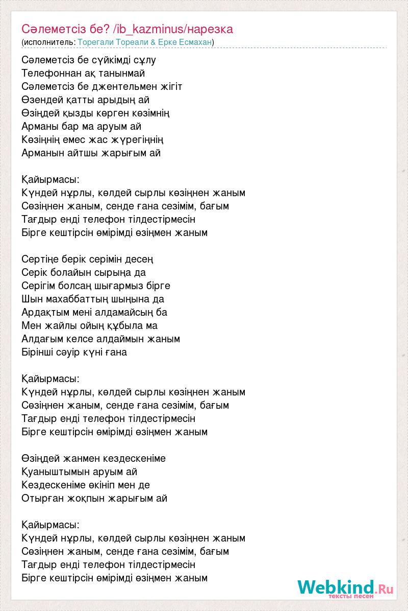 Сәлеметсіз бе сүйкімді сұлу Телефоннан ақ танынмай Сәлеметсіз бе джентельмен жігіт Өзендей қатты арыдың ай Өзіңдей қызды көрген көзімнің Арманы бар ма аруым ай Көзіңнің емес жас жүрегіңнің Арманын айтшы жарығым ай Қайырмасы: Күндей нұрлы, көлдей сырлы көзіңнен жаным Сөзіңнен жаным, сенде ғана сезімім, бағым Тағдыр енді телефон тілдестірмесін Бірге кештірсін өмірімді өзіңмен жаным Сертіңе берік серімін десең Серік болайын сырыңа да Серігім болсаң шығармыз бірге Шын махаббаттың шыңына да Ардақтым мені алдамайсың ба Мен жайлы ойың құбыла ма Алдағым келсе алдаймын жаным Бірінші сәуір күні ғана Қайырмасы: Күндей нұрлы, көлдей сырлы көзіңнен жаным Сөзіңнен жаным, сенде ғана сезімім, бағым Тағдыр енді телефон тілдестірмесін Бірге кештірсін өмірімді өзіңмен жаным Өзіңдей жанмен кездескеніме Қуаныштымын аруым ай Кездескеніме өкініп мен де Отырған жоқпын жарығым ай Қайырмасы: Күндей нұрлы, көлдей сырлы көзіңнен жаным Сөзіңнен жаным, сенде ғана сезімім, бағым Тағдыр енді телефон тілдестірмесін Бірге кештірсін өмірімді өзіңмен жаным