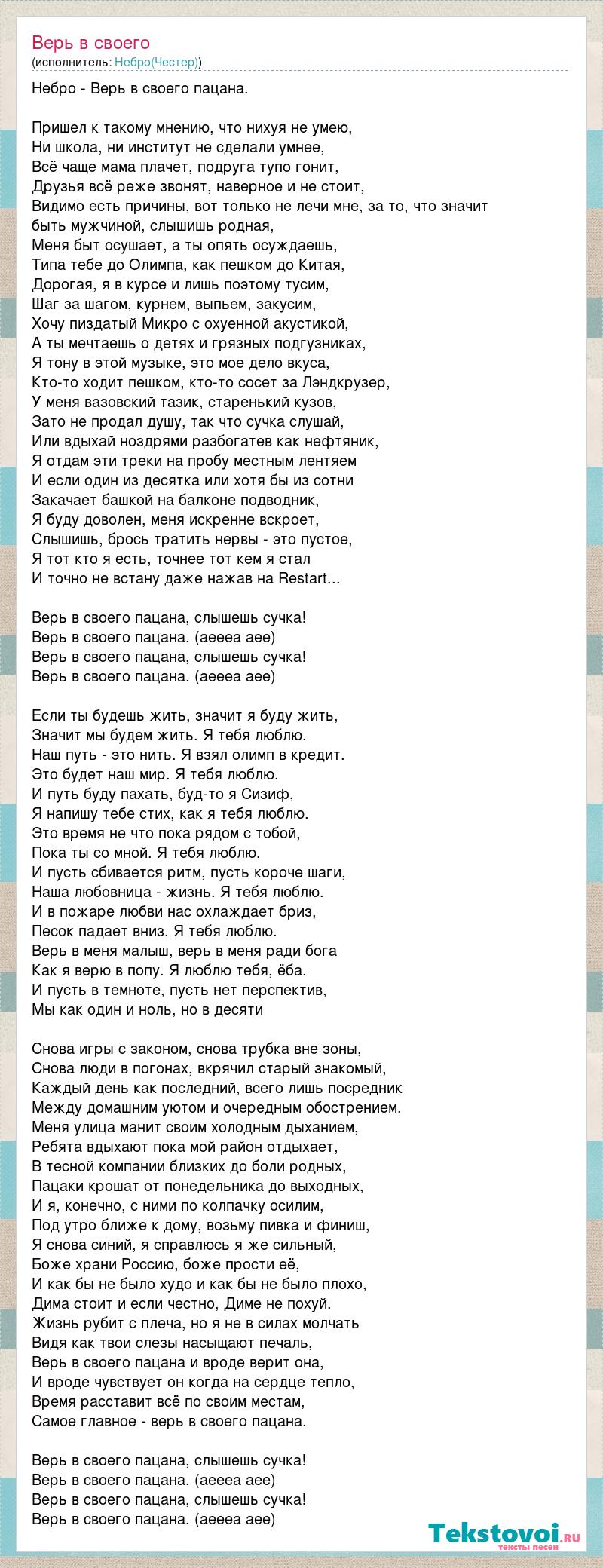 Небро - Верь в своего пацана. Пришел к такому мнению, что нихуя не умею, Ни школа, ни институт не сделали умнее, Всё чаще мама плачет, подруга тупо гонит, Друзья всё реже звонят, наверное и не стоит, Видимо есть причины, вот только не лечи мне, за то, что значит быть мужчиной, слышишь родная, Меня быт осушает, а ты опять осуждаешь, Типа тебе до Олимпа, как пешком до Китая, Дорогая, я в курсе и лишь поэтому тусим, Шаг за шагом, курнем, выпьем, закусим, Хочу пиздатый Микро с охуенной акустикой, А ты мечтаешь о детях и грязных подгузниках, Я тону в этой музыке, это мое дело вкуса, Кто-то ходит пешком, кто-то сосет за Лэндкрузер, У меня вазовский тазик, старенький кузов, Зато не продал душу, так что сучка слушай, Или вдыхай ноздрями разбогатев как нефтяник, Я отдам эти треки на пробу местным лентяем И если один из десятка или хотя бы из сотни Закачает башкой на балконе подводник, Я буду доволен, меня искренне вскроет, Слышишь, брось тратить нервы - это пустое, Я тот кто я есть, точнее тот кем я стал И точно не встану даже нажав на Restart... Верь в своего пацана, слышешь сучка! Верь в своего пацана. (аеееа аее) Верь в своего пацана, слышешь сучка! Верь в своего пацана. (аеееа аее) Если ты будешь жить, значит я буду жить, Значит мы будем жить. Я тебя люблю. Наш путь - это нить. Я взял олимп в кредит. Это будет наш мир. Я тебя люблю. И путь буду пахать, буд-то я Сизиф, Я напишу тебе стих, как я тебя люблю. Это время не что пока рядом с тобой, Пока ты со мной. Я тебя люблю. И пусть сбивается ритм, пусть короче шаги, Наша любовница - жизнь. Я тебя люблю. И в пожаре любви нас охлаждает бриз, Песок падает вниз. Я тебя люблю. Верь в меня малыш, верь в меня ради бога Как я верю в попу. Я люблю тебя, ёба. И пусть в темноте, пусть нет перспектив, Мы как один и ноль, но в десяти Снова игры с законом, снова трубка вне зоны, Снова люди в погонах, вкрячил старый знакомый, Каждый день как последний, всего лишь посредник Между домашним уютом и очередным обострением. Меня улица манит своим холодным дыханием, Ребята вдыхают пока мой район отдыхает, В тесной компании близких до боли родных, Пацаки крошат от понедельника до выходных, И я, конечно, с ними по колпачку осилим, Под утро ближе к дому, возьму пивка и финиш, Я снова синий, я справлюсь я же сильный, Боже храни Россию, боже прости её, И как бы не было худо и как бы не было плохо, Дима стоит и если честно, Диме не похуй. Жизнь рубит с плеча, но я не в силах молчать Видя как твои слезы насыщают печаль, Верь в своего пацана и вроде верит она, И вроде чувствует он когда на сердце тепло, Время расставит всё по своим местам, Самое главное - верь в своего пацана. Верь в своего пацана, слышешь сучка! Верь в своего пацана. (аеееа аее) Верь в своего пацана, слышешь сучка! Верь в своего пацана. (аеееа аее)