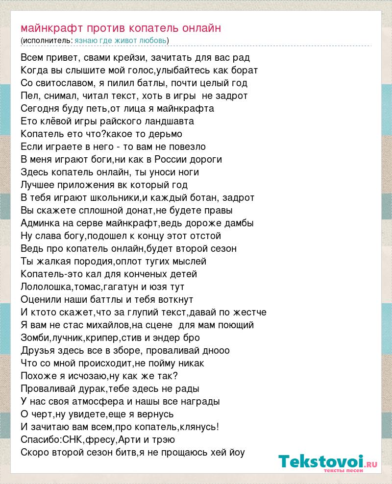 Всем привет, свами крейзи, зачитать для вас рад Когда вы слышите мой голос,улыбайтесь как борат Со свитославом, я пилил батлы, почти целый год Пел, снимал, читал текст, хоть в игры не задрот Сегодня буду петь,от лица я майнкрафта Ето клёвой игры райского ландшавта Копатель ето что?какое то дерьмо Если играете в него - то вам не повезло В меня играют боги,ни как в России дороги Здесь копатель онлайн, ты уноси ноги Лучшее приложения вк который год В тебя играют школьники,и каждый ботан, задрот Вы скажете сплошной донат,не будете правы Админка на серве майнкрафт,ведь дороже дамбы Ну слава богу,подошел к концу этот отстой Ведь про копатель онлайн,будет второй сезон Ты жалкая породия,оплот тугих мыслей Копатель-это кал для конченых детей Лололошка,томас,гагатун и юзя тут Оценили наши баттлы и тебя воткнут И ктото скажет,что за глупий текст,давай по жестче Я вам не стас михайлов,на сцене для мам поющий Зомби,лучник,крипер,стив и эндер бро Друзья здесь все в зборе, проваливай днооо Что со мной происходит,не пойму никак Похоже я исчозаю,ну как же так? Проваливай дурак,тебе здесь не рады У нас своя атмосфера и нашы все награды О черт,ну увидете,еще я вернусь И зачитаю вам всем,про копатель,клянусь! Спасибо:СНК,фресу,Арти и трэю Скоро второй сезон битв,я не прощаюсь хей йоу