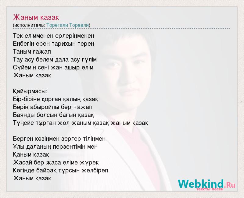 Тек елімменен ерлеріңменен Еңбегін ерен тарихын терең Таным ғажап Тау асу белем дала асу гүлім Сүйемін сені жан ашыр елім Жаным қазақ Қайырмасы: Бір-біріне қорған қалың қазақ Бәрің абыройлы бәрі ғажап Баянды болсын бағың қазақ Түңейе тұрған жол жаным қазақ жаным қазақ Берген көзіңмен зергер тіліңмен Ұлы даланың перзентімін мен Қаным қазақ Жасай бер жаса еліме жүрек Көгіңде байрақ тұрсын желбіреп Жаным қазақ