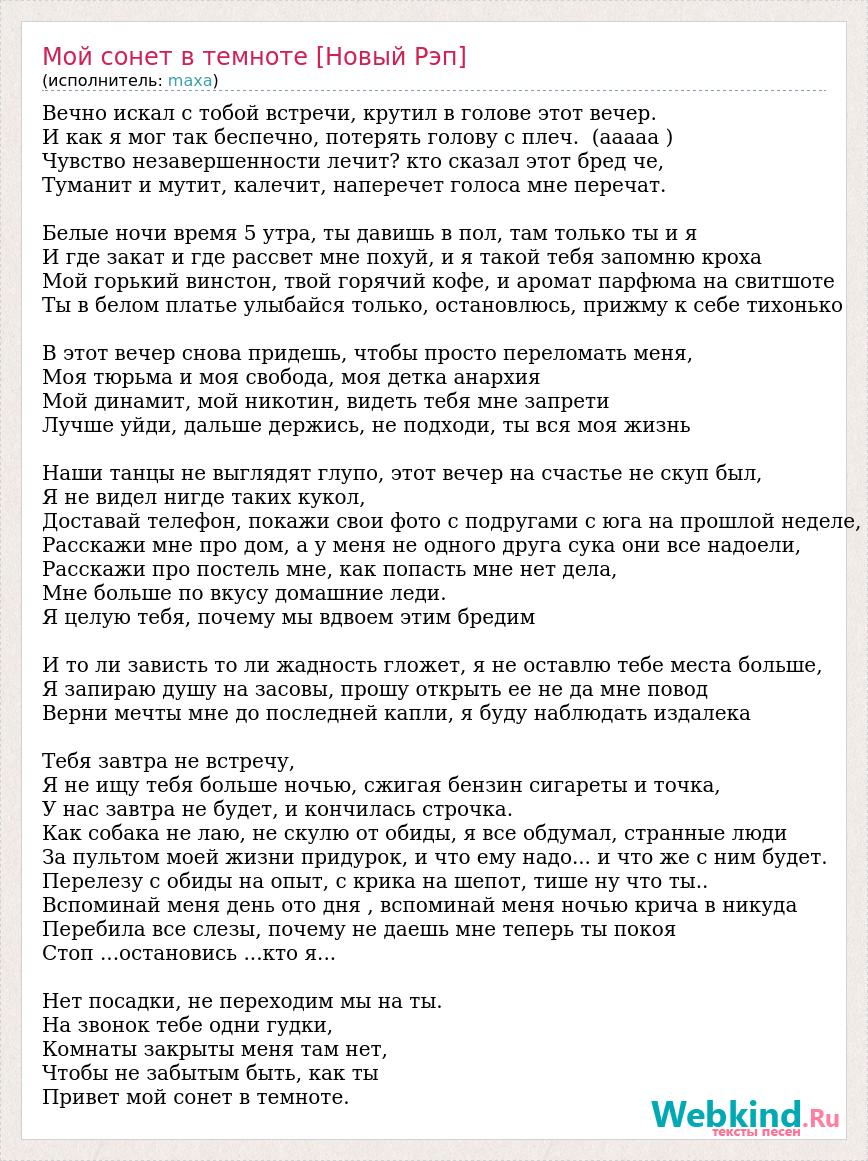 Вечно искал с тобой встречи, крутил в голове этот вечер. И как я мог так беспечно, потерять голову с плеч. (ааааа ) Чувство незавершенности лечит? кто сказал этот бред че, Туманит и мутит, калечит, наперечет голоса мне перечат. Белые ночи время 5 утра, ты давишь в пол, там только ты и я И где закат и где рассвет мне похуй, и я такой тебя запомню кроха Мой горький винстон, твой горячий кофе, и аромат парфюма на свитшоте Ты в белом платье улыбайся только, остановлюсь, прижму к себе тихонько В этот вечер снова придешь, чтобы просто переломать меня, Моя тюрьма и моя свобода, моя детка анархия Мой динамит, мой никотин, видеть тебя мне запрети Лучше уйди, дальше держись, не подходи, ты вся моя жизнь Наши танцы не выглядят глупо, этот вечер на счастье не скуп был, Я не видел нигде таких кукол, Доставай телефон, покажи свои фото с подругами с юга на прошлой неделе, Расскажи мне про дом, а у меня не одного друга сука они все надоели, Расскажи про постель мне, как попасть мне нет дела, Мне больше по вкусу домашние леди. Я целую тебя, почему мы вдвоем этим бредим И то ли зависть то ли жадность гложет, я не оставлю тебе места больше, Я запираю душу на засовы, прошу открыть ее не да мне повод Верни мечты мне до последней капли, я буду наблюдать издалека Тебя завтра не встречу, Я не ищу тебя больше ночью, сжигая бензин сигареты и точка, У нас завтра не будет, и кончилась строчка. Как собака не лаю, не скулю от обиды, я все обдумал, странные люди За пультом моей жизни придурок, и что ему надо... и что же с ним будет. Перелезу с обиды на опыт, с крика на шепот, тише ну что ты.. Вспоминай меня день ото дня , вспоминай меня ночью крича в никуда Перебила все слезы, почему не даешь мне теперь ты покоя Стоп ...остановись ...кто я... Нет посадки, не переходим мы на ты. На звонок тебе одни гудки, Комнаты закрыты меня там нет, Чтобы не забытым быть, как ты Привет мой сонет в темноте.
