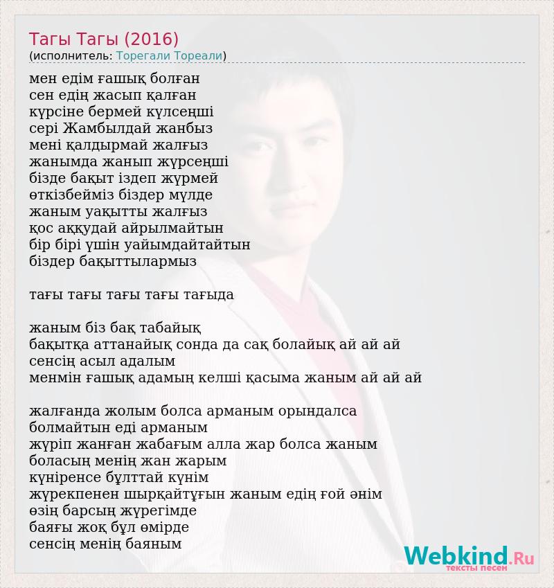 мен едім ғашық болған сен едің жасып қалған күрсіне бермей күлсеңші сері Жамбылдай жанбыз мені қалдырмай жалғыз жанымда жанып жүрсеңші бізде бақыт іздеп жүрмей өткізбейміз біздер мүлде жаным уақытты жалғыз қос аққудай айрылмайтын бір бірі үшін уайымдайтайтын біздер бақыттылармыз тағы тағы тағы тағы тағыда жаным біз бақ табайық бақытқа аттанайық сонда да сақ болайық ай ай ай сенсің асыл адалым менмін ғашық адамың келші қасыма жаным ай ай ай жалғанда жолым болса арманым орындалса болмайтын еді арманым жүріп жанған жабағым алла жар болса жаным боласың менің жан жарым күніренсе бұлттай күнім жүрекпенен шырқайтұғын жаным едің ғой әнім өзің барсың жүрегімде баяғы жоқ бұл өмірде сенсің менің баяным