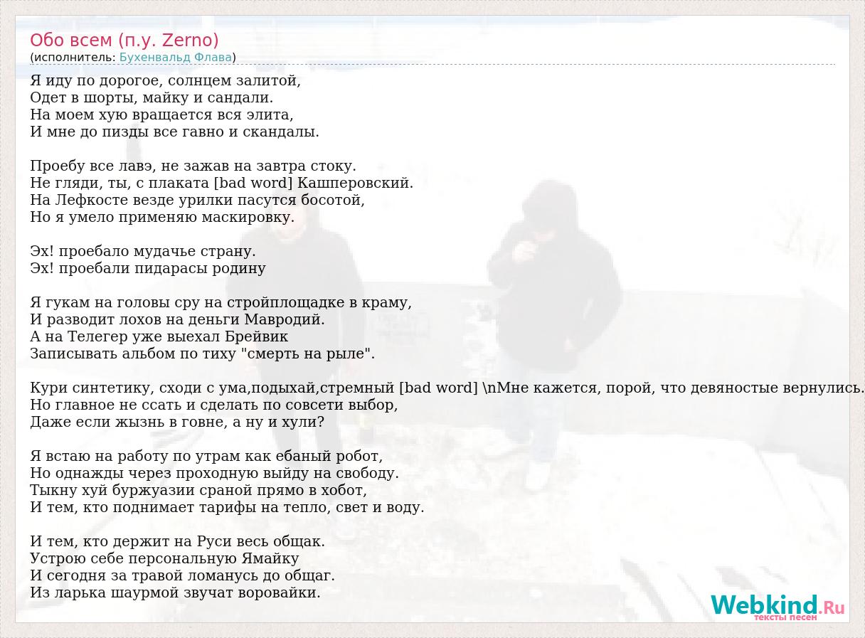 Я иду по дорогое, солнцем залитой, Одет в шорты, майку и сандали. На моем хую вращается вся элита, И мне до пизды все гавно и скандалы. Проебу все лавэ, не зажав на завтра стоку. Не гляди, ты, с плаката [bad word] Кашперовский. На Лефкосте везде урилки пасутся босотой, Но я умело применяю маскировку. Эх! проебало мудачье страну. Эх! проебали пидарасы родину Я гукам на головы сру на стройплощадке в краму, И разводит лохов на деньги Мавродий. А на Телегер уже выехал Брейвик Записывать альбом по тиху "смерть на рыле". Кури синтетику, сходи с ума,подыхай,стремный [bad word] \nМне кажется, порой, что девяностые вернулись. Но главное не ссать и сделать по совсети выбор, Даже если жызнь в говне, а ну и хули? Я встаю на работу по утрам как ебаный робот, Но однажды через проходную выйду на свободу. Тыкну хуй буржуазии сраной прямо в хобот, И тем, кто поднимает тарифы на тепло, свет и воду. И тем, кто держит на Руси весь общак. Устрою себе персональную Ямайку И сегодня за травой ломанусь до общаг. Из ларька шаурмой звучат воровайки.