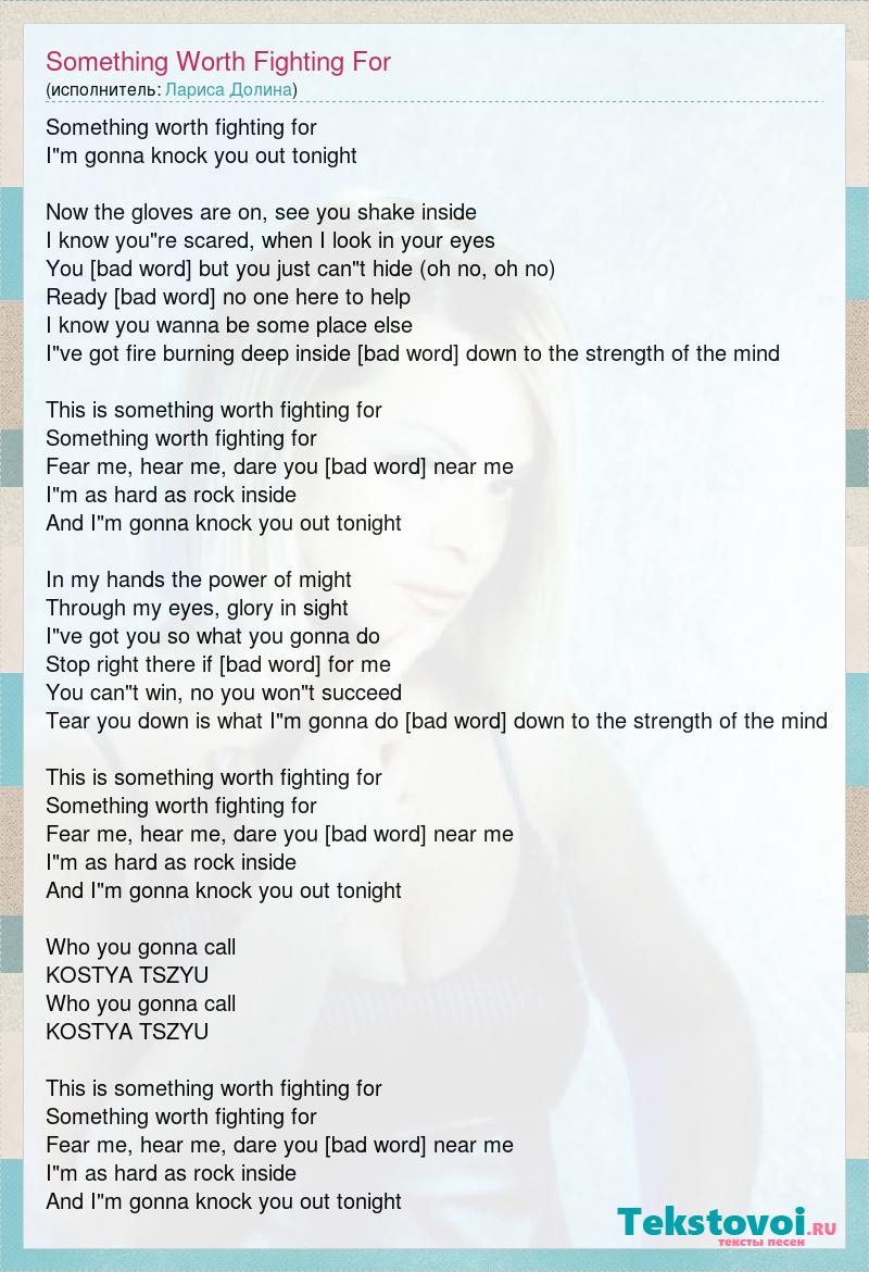 Something worth fighting for I"m gonna knock you out tonight Now the gloves are on, see you shake inside I know you"re scared, when I look in your eyes You can run but you just can"t hide (oh no, oh no) Ready to rumble no one here to help I know you wanna be some place else I"ve got fire burning deep inside It comes down to the strength of the mind This is something worth fighting for Something worth fighting for Fear me, hear me, dare you to come near me I"m as hard as rock inside And I"m gonna knock you out tonight In my hands the power of might Through my eyes, glory in sight I"ve got you so what you gonna do Stop right there if you come for me You can"t win, no you won"t succeed Tear you down is what I"m gonna do It comes down to the strength of the mind This is something worth fighting for Something worth fighting for Fear me, hear me, dare you to come near me I"m as hard as rock inside And I"m gonna knock you out tonight Who you gonna call KOSTYA TSZYU Who you gonna call KOSTYA TSZYU This is something worth fighting for Something worth fighting for Fear me, hear me, dare you to come near me I"m as hard as rock inside And I"m gonna knock you out tonight