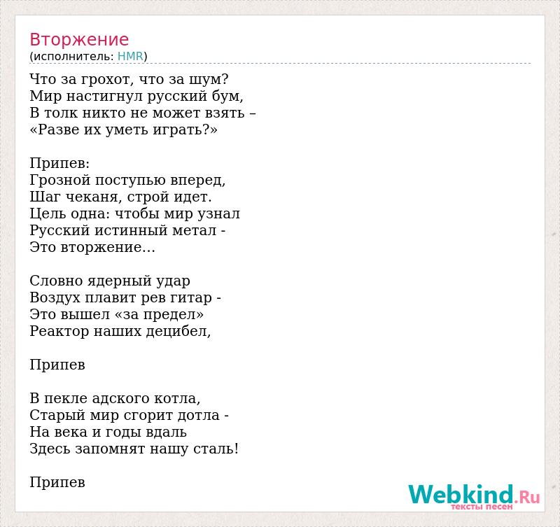 Что за грохот, что за шум? Мир настигнул русский бум, В толк никто не может взять – «Разве их уметь играть?» Припев: Грозной поступью вперед, Шаг чеканя, строй идет. Цель одна: чтобы мир узнал Русский истинный метал - Это вторжение… Словно ядерный удар Воздух плавит рев гитар - Это вышел «за предел» Реактор наших децибел, Припев В пекле адского котла, Старый мир сгорит дотла - На века и годы вдаль Здесь запомнят нашу сталь! Припев