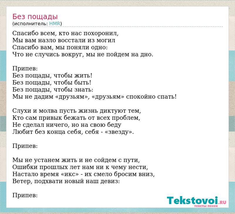 Спасибо всем, кто нас похоронил, Мы вам назло восстали из могил Спасибо вам, мы поняли одно: Что не случись вокруг, мы не пойдем на дно. Припев: Без пощады, чтобы жить! Без пощады, чтобы быть! Без пощады, чтобы знать: Мы не дадим «друзьям», «друзьям» спокойно спать! Слухи и молва пусть жизнь диктуют тем, Кто сам привык бежать от всех проблем, Не сделал ничего, но на свою беду Любит без конца себя, себя - «звезду». Припев: Мы не устанем жить и не сойдем с пути, Ошибки прошлых лет нам ни к чему нести, Настало время «икс» - их смело бросим вниз, Ветер, подхвати новый наш девиз: Припев: