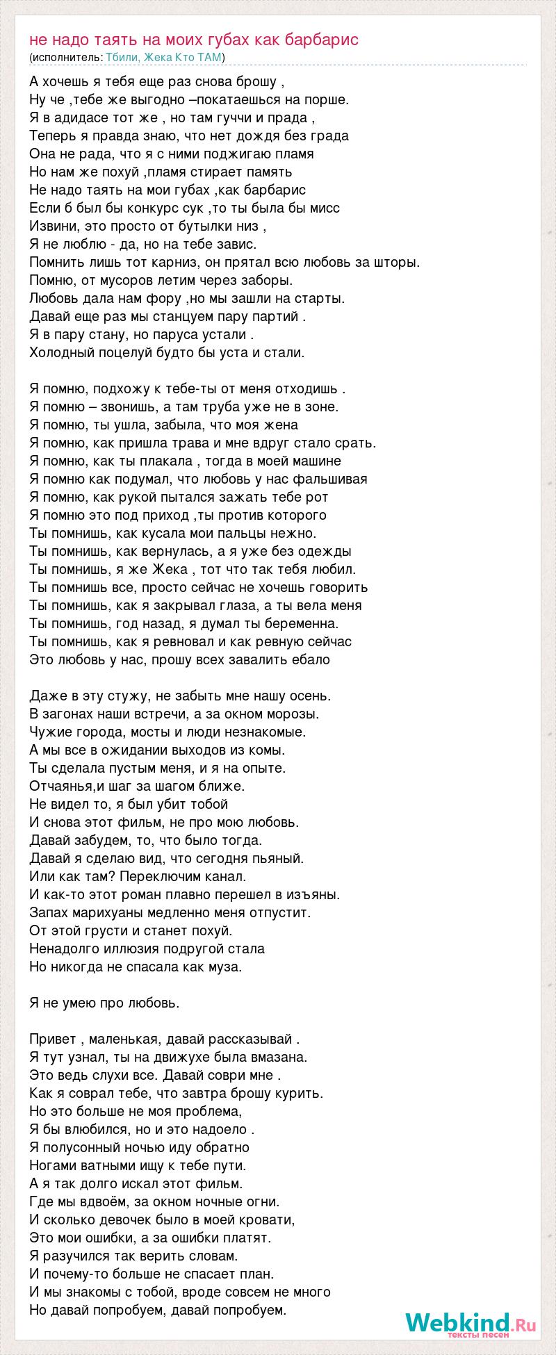 А хочешь я тебя еще раз снова брошу , Ну че ,тебе же выгодно –покатаешься на порше. Я в адидасе тот же , но там гуччи и прада , Теперь я правда знаю, что нет дождя без града Она не рада, что я с ними поджигаю пламя Но нам же похуй ,пламя стирает память Не надо таять на мои губах ,как барбарис Если б был бы конкурс сук ,то ты была бы мисс Извини, это просто от бутылки низ , Я не люблю - да, но на тебе завис. Помнить лишь тот карниз, он прятал всю любовь за шторы. Помню, от мусоров летим через заборы. Любовь дала нам фору ,но мы зашли на старты. Давай еще раз мы станцуем пару партий . Я в пару стану, но паруса устали . Холодный поцелуй будто бы уста и стали. Я помню, подхожу к тебе-ты от меня отходишь . Я помню – звонишь, а там труба уже не в зоне. Я помню, ты ушла, забыла, что моя жена Я помню, как пришла трава и мне вдруг стало срать. Я помню, как ты плакала , тогда в моей машине Я помню как подумал, что любовь у нас фальшивая Я помню, как рукой пытался зажать тебе рот Я помню это под приход ,ты против которого Ты помнишь, как кусала мои пальцы нежно. Ты помнишь, как вернулась, а я уже без одежды Ты помнишь, я же Жека , тот что так тебя любил. Ты помнишь все, просто сейчас не хочешь говорить Ты помнишь, как я закрывал глаза, а ты вела меня Ты помнишь, год назад, я думал ты беременна. Ты помнишь, как я ревновал и как ревную сейчас Это любовь у нас, прошу всех завалить ебало Даже в эту стужу, не забыть мне нашу осень. В загонах наши встречи, а за окном морозы. Чужие города, мосты и люди незнакомые. А мы все в ожидании выходов из комы. Ты сделала пустым меня, и я на опыте. Отчаянья,и шаг за шагом ближе. Не видел то, я был убит тобой И снова этот фильм, не про мою любовь. Давай забудем, то, что было тогда. Давай я сделаю вид, что сегодня пьяный. Или как там? Переключим канал. И как-то этот роман плавно перешел в изъяны. Запах марихуаны медленно меня отпустит. От этой грусти и станет похуй. Ненадолго иллюзия подругой стала Но никогда не спасала как муза. Я не умею про любовь. Привет , маленькая, давай рассказывай . Я тут узнал, ты на движухе была вмазана. Это ведь слухи все. Давай соври мне . Как я соврал тебе, что завтра брошу курить. Но это больше не моя проблема, Я бы влюбился, но и это надоело . Я полусонный ночью иду обратно Ногами ватными ищу к тебе пути. А я так долго искал этот фильм. Где мы вдвоём, за окном ночные огни. И сколько девочек было в моей кровати, Это мои ошибки, а за ошибки платят. Я разучился так верить словам. И почему-то больше не спасает план. И мы знакомы с тобой, вроде совсем не много Но давай попробуем, давай попробуем.