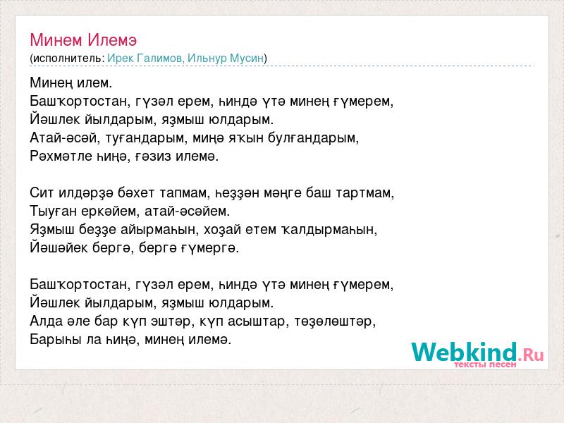 Минең илем. Башҡортостан, гүзәл ерем, һиндә үтә минең ғүмерем, Йәшлек йылдарым, яҙмыш юлдарым. Атай-әсәй, туғандарым, миңә яҡын булғандарым, Рәхмәтле һиңә, ғәзиз илемә. Сит илдәрҙә бәхет тапмам, һеҙҙән мәңге баш тартмам, Тыуған еркәйем, атай-әсәйем. Яҙмыш беҙҙе айырмаһын, хоҙай етем ҡалдырмаһын, Йәшәйек бергә, бергә ғүмергә. Башҡортостан, гүзәл ерем, һиндә үтә минең ғүмерем, Йәшлек йылдарым, яҙмыш юлдарым. Алда әле бар күп эштәр, күп асыштар, төҙөлөштәр, Барыһы ла һиңә, минең илемә.