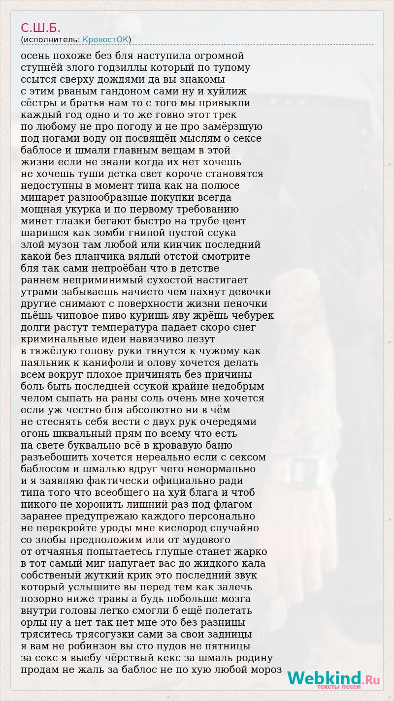 осень похоже без бля наступила огромной ступнёй злого годзиллы который по тупому ссытся сверху дождями да вы знакомы с этим рваным гандоном сами ну и хуйлиж сёстры и братья нам то с того мы привыкли каждый год одно и то же говно этот трек по любому не про погоду и не про замёрзшую под ногами воду он посвящён мыслям о сексе баблосе и шмали главным вещам в этой жизни если не знали когда их нет хочешь не хочешь туши детка свет короче становятся недоступны в момент типа как на полюсе минарет разнообразные покупки всегда мощная укурка и по первому требованию минет глазки бегают быстро на трубе цент шаришся как зомби гнилой пустой ссука злой музон там любой или кинчик последний какой без планчика вялый отстой смотрите бля так сами непроёбан что в детстве раннем неприминимый сухостой настигает утрами забываешь начисто чем пахнут девочки другие снимают с поверхности жизни пеночки пьёшь чиповое пиво куришь яву жрёшь чебурек долги растут температура падает скоро снег криминальные идеи навязчиво лезут в тяжёлую голову руки тянутся к чужому как паяльник к канифоли и олову хочется делать всем вокруг плохое причинять без причины боль быть последней ссукой крайне недобрым челом сыпать на раны соль очень мне хочется если уж честно бля абсолютно ни в чём не стеснять себя вести с двух рук очередями огонь шквальный прям по всему что есть на свете буквально всё в кровавую баню разъебошить хочется нереально если с сексом баблосом и шмалью вдруг чего ненормально и я заявляю фактически официально ради типа того что всеобщего на хуй блага и чтоб никого не хоронить лишний раз под флагом заранее предупрежаю каждого персонально не перекройте уроды мне кислород случайно со злобы предположим или от мудового от отчаянья попытаетесь глупые станет жарко в тот самый миг напугает вас до жидкого кала собственый жуткий крик это последний звук который услышите вы перед тем как залечь позорно ниже травы а будь побольше мозга внутри головы легко смогли б ещё полетать орлы ну а нет так нет мне это без разницы тряситесь трясогузки сами за свои задницы я вам не робинзон вы сто пудов не пятницы за секс я выебу чёрствый кекс за шмаль родину продам не жаль за баблос не по хую любой мороз