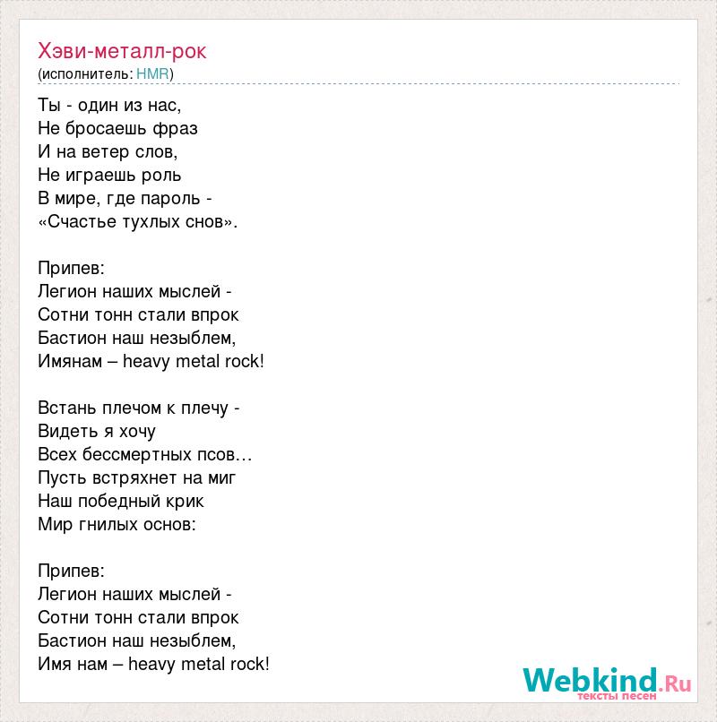 Ты - один из нас, Не бросаешь фраз И на ветер слов, Не играешь роль В мире, где пароль - «Счастье тухлых снов». Припев: Легион наших мыслей - Сотни тонн стали впрок Бастион наш незыблем, Имянам – heavy metal rock! Встань плечом к плечу - Видеть я хочу Всех бессмертных псов… Пусть встряхнет на миг Наш победный крик Мир гнилых основ: Припев: Легион наших мыслей - Сотни тонн стали впрок Бастион наш незыблем, Имя нам – heavy metal rock!