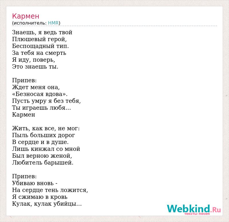 Знаешь, я ведь твой Плюшевый герой, Беспощадный тип. За тебя на смерть Я иду, поверь, Это знаешь ты. Припев: Ждет меня она, «Безносая вдова». Пусть умру я без тебя, Ты играешь любя… Кармен Жить, как все, не мог: Пыль больших дорог В сердце и в душе. Лишь кинжал со мной Был верною женой, Любитель барышей. Припев: Убиваю вновь - На сердце тень ложится, Я сжимаю в кровь Кулак, кулак убийцы…
