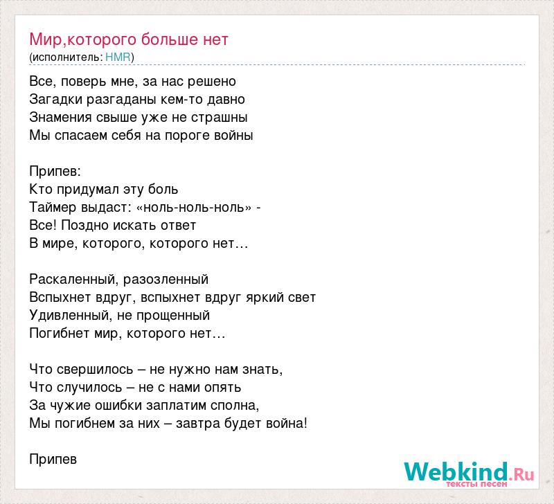Все, поверь мне, за нас решено Загадки разгаданы кем-то давно Знамения свыше уже не страшны Мы спасаем себя на пороге войны Припев: Кто придумал эту боль Таймер выдаст: «ноль-ноль-ноль» - Все! Поздно искать ответ В мире, которого, которого нет… Раскаленный, разозленный Вспыхнет вдруг, вспыхнет вдруг яркий свет Удивленный, не прощенный Погибнет мир, которого нет… Что свершилось – не нужно нам знать, Что случилось – не с нами опять За чужие ошибки заплатим сполна, Мы погибнем за них – завтра будет война! Припев