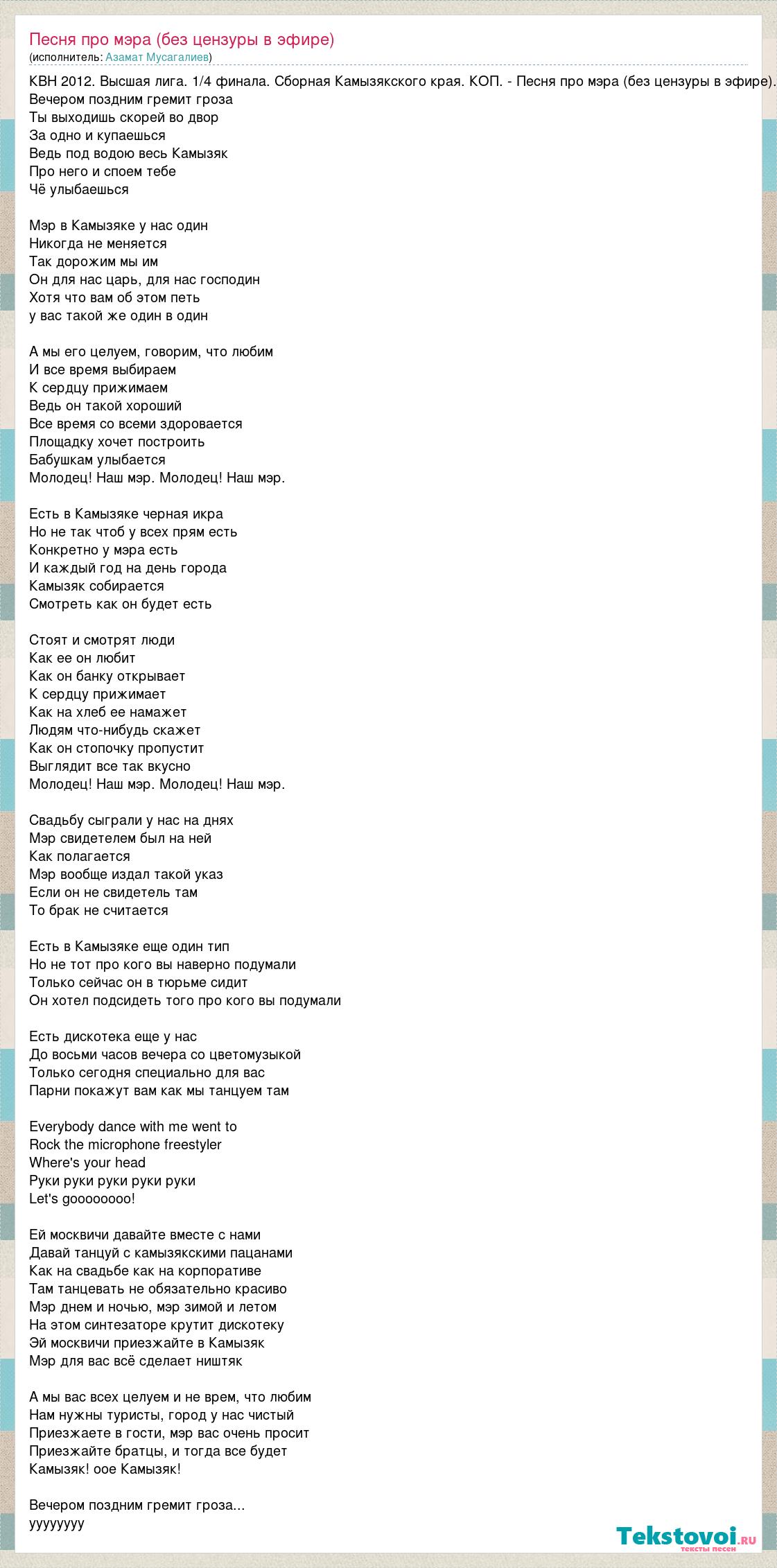 КВН 2012. Высшая лига. 1/4 финала. Сборная Камызякского края. КОП. - Песня про мэра (без цензуры в эфире). Вечером поздним гремит гроза Ты выходишь скорей во двор За одно и купаешься Ведь под водою весь Камызяк Про него и споем тебе Чё улыбаешься Мэр в Камызяке у нас один Никогда не меняется Так дорожим мы им Он для нас царь, для нас господин Хотя что вам об этом петь у вас такой же один в один А мы его целуем, говорим, что любим И все время выбираем К сердцу прижимаем Ведь он такой хороший Все время со всеми здоровается Площадку хочет построить Бабушкам улыбается Молодец! Наш мэр. Молодец! Наш мэр. Есть в Камызяке черная икра Но не так чтоб у всех прям есть Конкретно у мэра есть И каждый год на день города Камызяк собирается Смотреть как он будет есть Стоят и смотрят люди Как ее он любит Как он банку открывает К сердцу прижимает Как на хлеб ее намажет Людям что-нибудь скажет Как он стопочку пропустит Выглядит все так вкусно Молодец! Наш мэр. Молодец! Наш мэр. Свадьбу сыграли у нас на днях Мэр свидетелем был на ней Как полагается Мэр вообще издал такой указ Если он не свидетель там То брак не считается Есть в Камызяке еще один тип Но не тот про кого вы наверно подумали Только сейчас он в тюрьме сидит Он хотел подсидеть того про кого вы подумали Есть дискотека еще у нас До восьми часов вечера со цветомузыкой Только сегодня специально для вас Парни покажут вам как мы танцуем там Everybody dance with me went to Rock the microphone freestyler Where's your head Руки руки руки руки руки Let's goooooooo! Ей москвичи давайте вместе с нами Давай танцуй с камызякскими пацанами Как на свадьбе как на корпоративе Там танцевать не обязательно красиво Мэр днем и ночью, мэр зимой и летом На этом синтезаторе крутит дискотеку Эй москвичи приезжайте в Камызяк Мэр для вас всё сделает ништяк А мы вас всех целуем и не врем, что любим Нам нужны туристы, город у нас чистый Приезжаете в гости, мэр вас очень просит Приезжайте братцы, и тогда все будет Камызяк! оое Камызяк! Вечером поздним гремит гроза... уууууууу