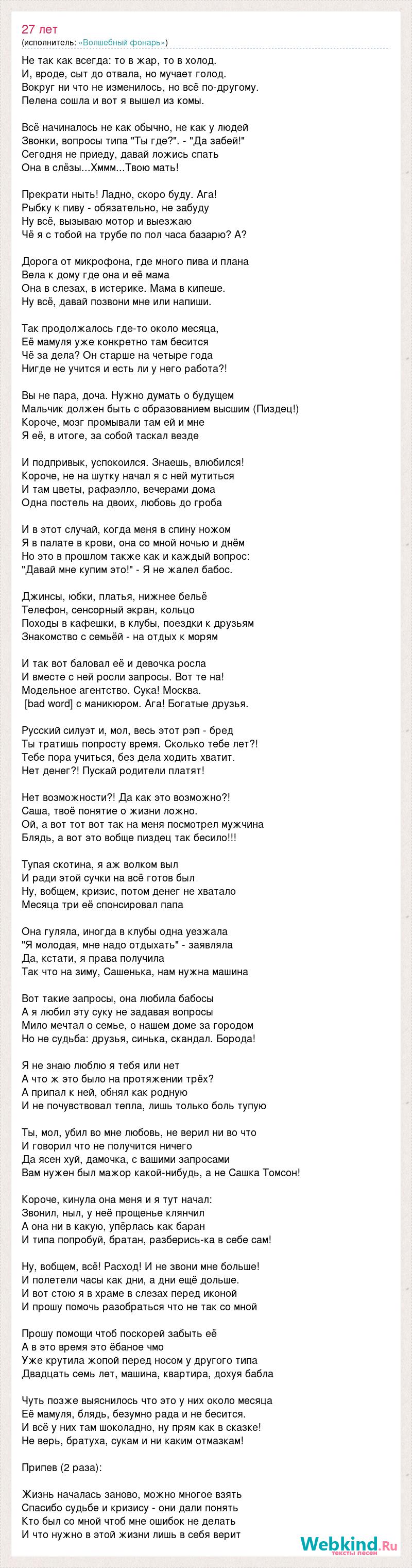Не так как всегда: то в жар, то в холод. И, вроде, сыт до отвала, но мучает голод. Вокруг ни что не изменилось, но всё по-другому. Пелена сошла и вот я вышел из комы. Всё начиналось не как обычно, не как у людей Звонки, вопросы типа "Ты где?". - "Да забей!" Сегодня не приеду, давай ложись спать Она в слёзы...Хммм...Твою мать! Прекрати ныть! Ладно, скоро буду. Ага! Рыбку к пиву - обязательно, не забуду Ну всё, вызываю мотор и выезжаю Чё я с тобой на трубе по пол часа базарю? А? Дорога от микрофона, где много пива и плана Вела к дому где она и её мама Она в слезах, в истерике. Мама в кипеше. Ну всё, давай позвони мне или напиши. Так продолжалось где-то около месяца, Её мамуля уже конкретно там бесится Чё за дела? Он старше на четыре года Нигде не учится и есть ли у него работа?! Вы не пара, доча. Нужно думать о будущем Мальчик должен быть с образованием высшим (Пиздец!) Короче, мозг промывали там ей и мне Я её, в итоге, за собой таскал везде И подпривык, успокоился. Знаешь, влюбился! Короче, не на шутку начал я с ней мутиться И там цветы, рафаэлло, вечерами дома Одна постель на двоих, любовь до гроба И в этот случай, когда меня в спину ножом Я в палате в крови, она со мной ночью и днём Но это в прошлом также как и каждый вопрос: "Давай мне купим это!" - Я не жалел бабос. Джинсы, юбки, платья, нижнее бельё Телефон, сенсорный экран, кольцо Походы в кафешки, в клубы, поездки к друзьям Знакомство с семьёй - на отдых к морям И так вот баловал её и девочка росла И вместе с ней росли запросы. Вот те на! Модельное агентство. Сука! Москва. [bad word] с маникюром. Ага! Богатые друзья. Русский силуэт и, мол, весь этот рэп - бред Ты тратишь попросту время. Сколько тебе лет?! Тебе пора учиться, без дела ходить хватит. Нет денег?! Пускай родители платят! Нет возможности?! Да как это возможно?! Саша, твоё понятие о жизни ложно. Ой, а вот тот вот так на меня посмотрел мужчина Блядь, а вот это вобще пиздец так бесило!!! Тупая скотина, я аж волком выл И ради этой сучки на всё готов был Ну, вобщем, кризис, потом денег не хватало Месяца три её спонсировал папа Она гуляла, иногда в клубы одна уезжала "Я молодая, мне надо отдыхать" - заявляла Да, кстати, я права получила Так что на зиму, Сашенька, нам нужна машина Вот такие запросы, она любила бабосы А я любил эту суку не задавая вопросы Мило мечтал о семье, о нашем доме за городом Но не судьба: друзья, синька, скандал. Борода! Я не знаю люблю я тебя или нет А что ж это было на протяжении трёх? А припал к ней, обнял как родную И не почувствовал тепла, лишь только боль тупую Ты, мол, убил во мне любовь, не верил ни во что И говорил что не получится ничего Да ясен хуй, дамочка, с вашими запросами Вам нужен был мажор какой-нибудь, а не Сашка Томсон! Короче, кинула она меня и я тут начал: Звонил, ныл, у неё прощенье клянчил А она ни в какую, упёрлась как баран И типа попробуй, братан, разберись-ка в себе сам! Ну, вобщем, всё! Расход! И не звони мне больше! И полетели часы как дни, а дни ещё дольше. И вот стою я в храме в слезах перед иконой И прошу помочь разобраться что не так со мной Прошу помощи чтоб поскорей забыть её А в это время это ёбаное чмо Уже крутила жопой перед носом у другого типа Двадцать семь лет, машина, квартира, дохуя бабла Чуть позже выяснилось что это у них около месяца Её мамуля, блядь, безумно рада и не бесится. И всё у них там шоколадно, ну прям как в сказке! Не верь, братуха, сукам и ни каким отм