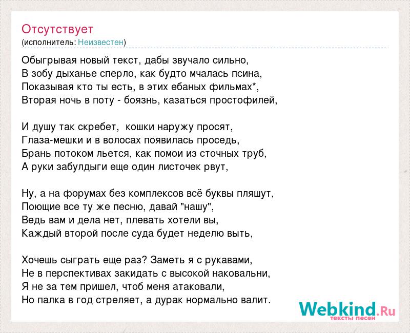 Обыгрывая новый текст, дабы звучало сильно, В зобу дыханье сперло, как будто мчалась псина, Показывая кто ты есть, в этих ебаных фильмах*, Вторая ночь в поту - боязнь, казаться простофилей, И душу так скребет, кошки наружу просят, Глаза-мешки и в волосах появилась проседь, Брань потоком льется, как помои из сточных труб, А руки забулдыги еще один листочек рвут, Ну, а на форумах без комплексов всё буквы пляшут, Поющие все ту же песню, давай "нашу", Ведь вам и дела нет, плевать хотели вы, Каждый второй после суда будет неделю выть, Хочешь сыграть еще раз? Заметь я с рукавами, Не в перспективах закидать с высокой наковальни, Я не за тем пришел, чтоб меня атаковали, Но палка в год стреляет, а дурак нормально валит.