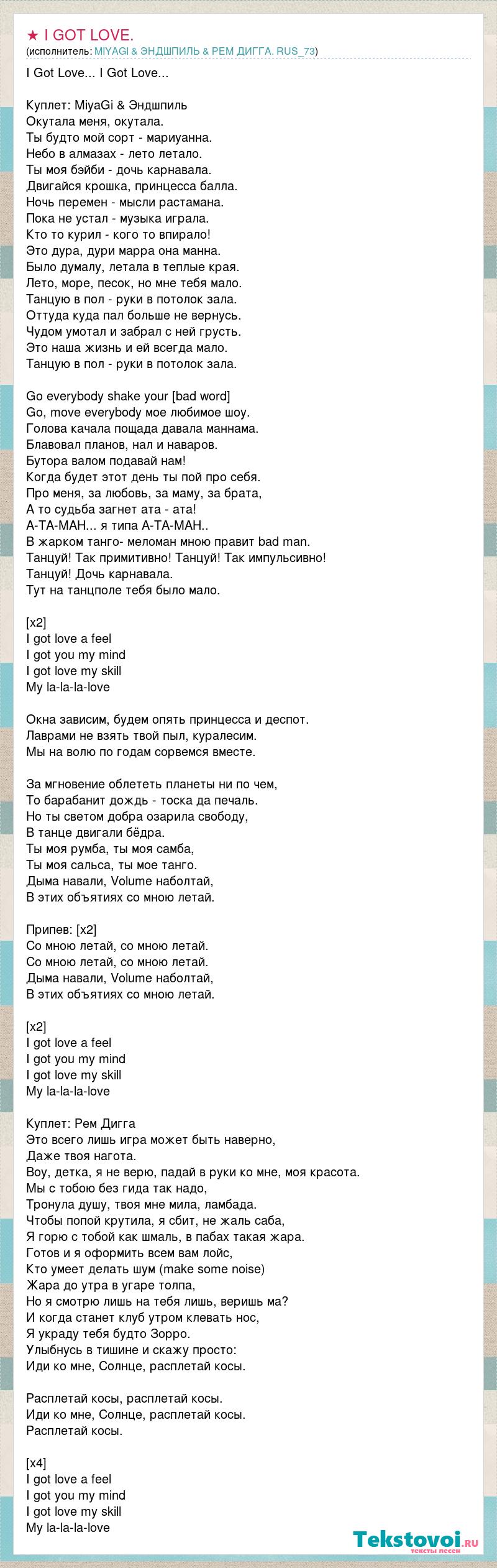 I Got Love... I Got Love... Куплет: MiyaGi & Эндшпиль Окутала меня, окутала. Ты будто мой сорт - мариуанна. Небо в алмазах - лето летало. Ты моя бэйби - дочь карнавала. Двигайся крошка, принцесса балла. Ночь перемен - мысли растамана. Пока не устал - музыка играла. Кто то курил - кого то впирало! Это дура, дури марра она манна. Было думалу, летала в теплые края. Лето, море, песок, но мне тебя мало. Танцую в пол - руки в потолок зала. Оттуда куда пал больше не вернусь. Чудом умотал и забрал с ней грусть. Это наша жизнь и ей всегда мало. Танцую в пол - руки в потолок зала. Go everybody shake your [bad word] Go, move everybody мое любимое шоу. Голова качала пощада давала маннама. Блавовал планов, нал и наваров. Бутора валом подавай нам! Когда будет этот день ты пой про себя. Про меня, за любовь, за маму, за брата, А то судьба загнет ата - ата! А-ТА-МАН... я типа А-ТА-МАН.. В жарком танго- меломан мною правит bad man. Танцуй! Так примитивно! Танцуй! Так импульсивно! Танцуй! Дочь карнавала. Тут на танцполе тебя было мало. [x2] I got love a feel I got you my mind I got love my skill My la-la-la-love Окна зависим, будем опять принцесса и деспот. Лаврами не взять твой пыл, куралесим. Мы на волю по годам сорвемся вместе. За мгновение облететь планеты ни по чем, То барабанит дождь - тоска да печаль. Но ты светом добра озарила свободу, В танце двигали бёдра. Ты моя румба, ты моя самба, Ты моя сальса, ты мое танго. Дыма навали, Volume наболтай, В этих объятиях со мною летай. Припев: [х2] Со мною летай, со мною летай. Со мною летай, со мною летай. Дыма навали, Volume наболтай, В этих объятиях со мною летай. [х2] I got love a feel I got you my mind I got love my skill My la-la-la-love Куплет: Рем Дигга Это всего лишь игра может быть наверно, Даже твоя нагота. Воу, детка, я не верю, падай в руки ко мне, моя красота. Мы с тобою без гида так надо, Тронула душу, твоя мне мила, ламбада. Чтобы попой крутила, я сбит, не жаль саба, Я горю с тобой как шмаль, в пабах такая жара. Готов и я оформить всем вам лойс, Кто умеет делать шум (make some noise) Жара до утра в угаре толпа, Но я смотрю лишь на тебя лишь, веришь ма? И когда станет клуб утром клевать нос, Я украду тебя будто Зорро. Улыбнусь в тишине и скажу просто: Иди ко мне, Солнце, расплетай косы. Расплетай косы, расплетай косы. Иди ко мне, Солнце, расплетай косы. Расплетай косы. [x4] I got love a feel I got you my mind I got love my skill My la-la-la-love
