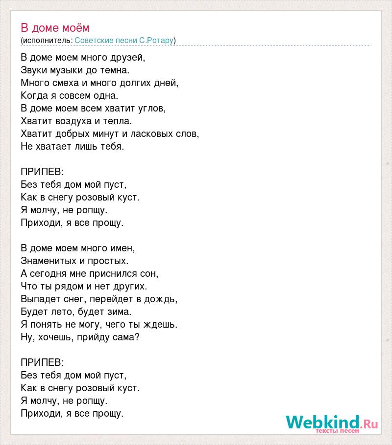 В доме моем много друзей, Звуки музыки до темна. Много смеха и много долгих дней, Когда я совсем одна. В доме моем всем хватит углов, Хватит воздуха и тепла. Хватит добрых минут и ласковых слов, Не хватает лишь тебя. ПРИПЕВ: Без тебя дом мой пуст, Как в снегу розовый куст. Я молчу, не ропщу. Приходи, я все прощу. В доме моем много имен, Знаменитых и простых. А сегодня мне приснился сон, Что ты рядом и нет других. Выпадет снег, перейдет в дождь, Будет лето, будет зима. Я понять не могу, чего ты ждешь. Ну, хочешь, прийду сама? ПРИПЕВ: Без тебя дом мой пуст, Как в снегу розовый куст. Я молчу, не ропщу. Приходи, я все прощу.